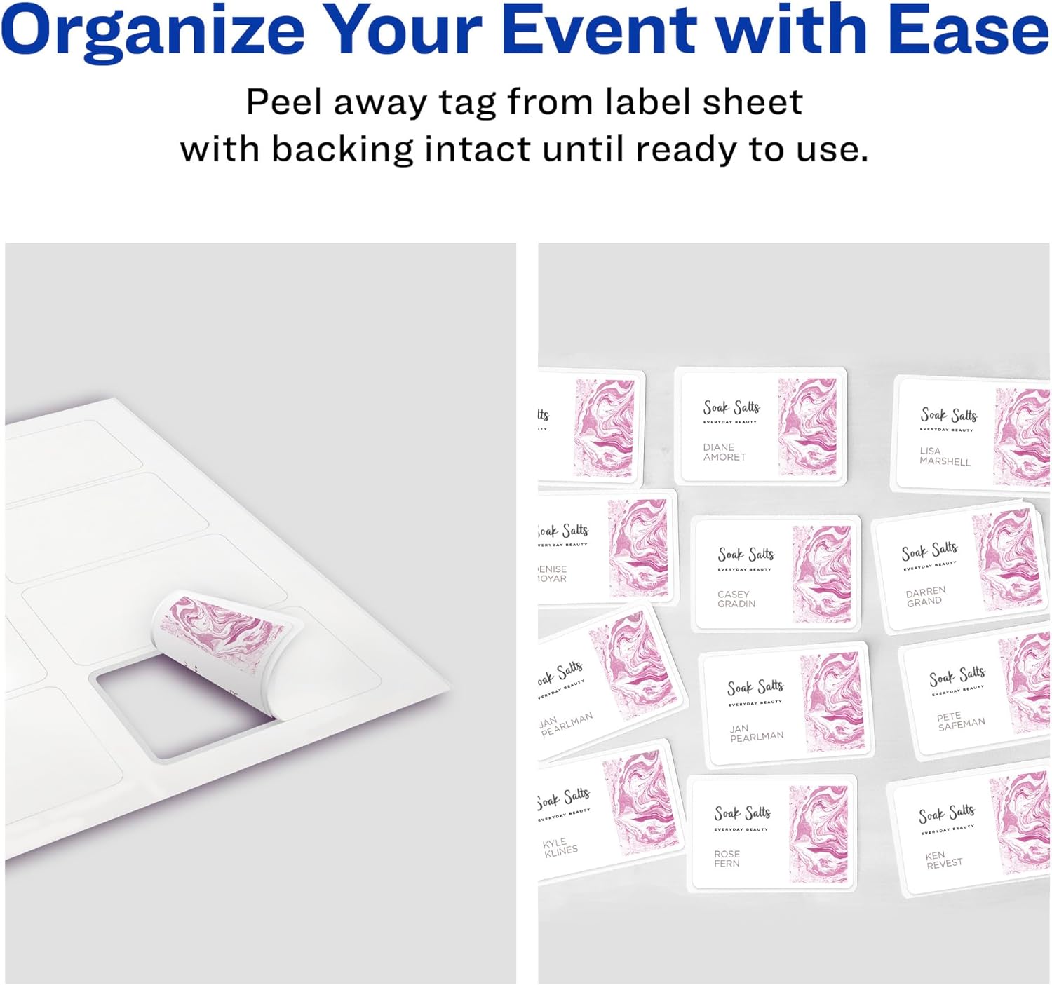 - Save time before your event with the unique peel-away design that allows you to separate each name tag from the printed sheet with the label backing still intact until ready to use