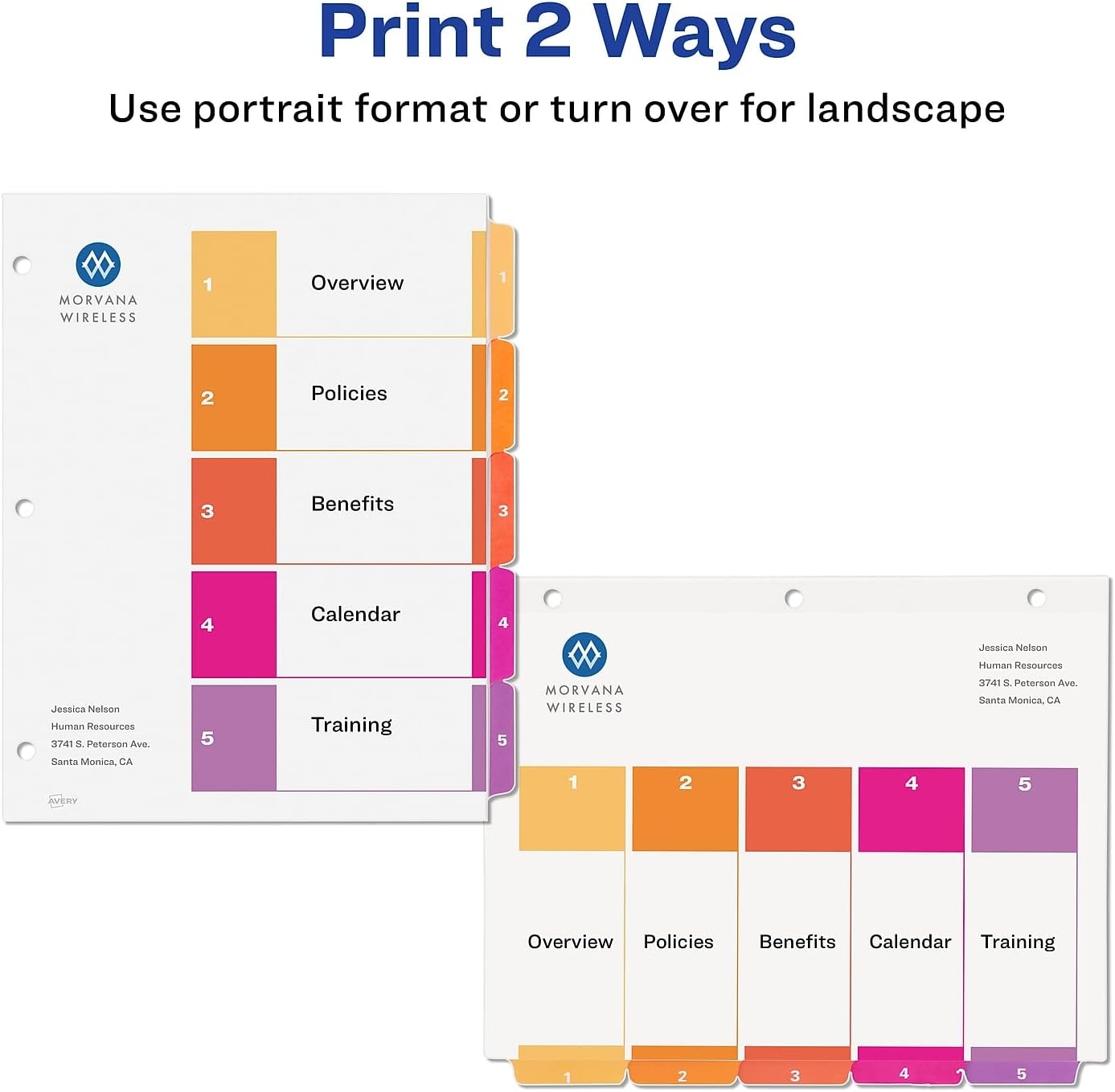 Avery 5 Tab Dividers for 3 Ring Binders, Customizable Table of Contents, Multicolor Tabs, 24 Sets (11167)