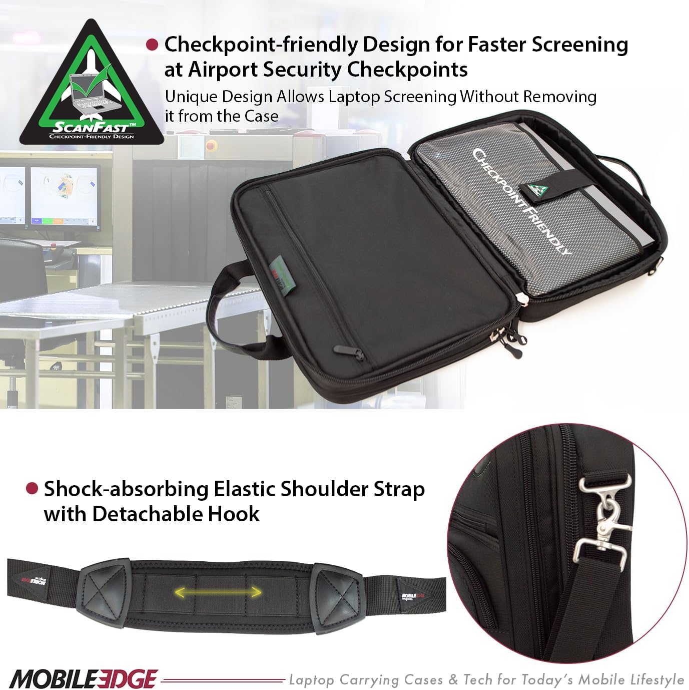 - STYLE MEETS FUNCTION – The Mobile Edge ScanFast laptop briefcase for men and women is made using main materials derived from water bottles. Designed to fit laptops up to 16″ and compatible with MacBooks up to 17″