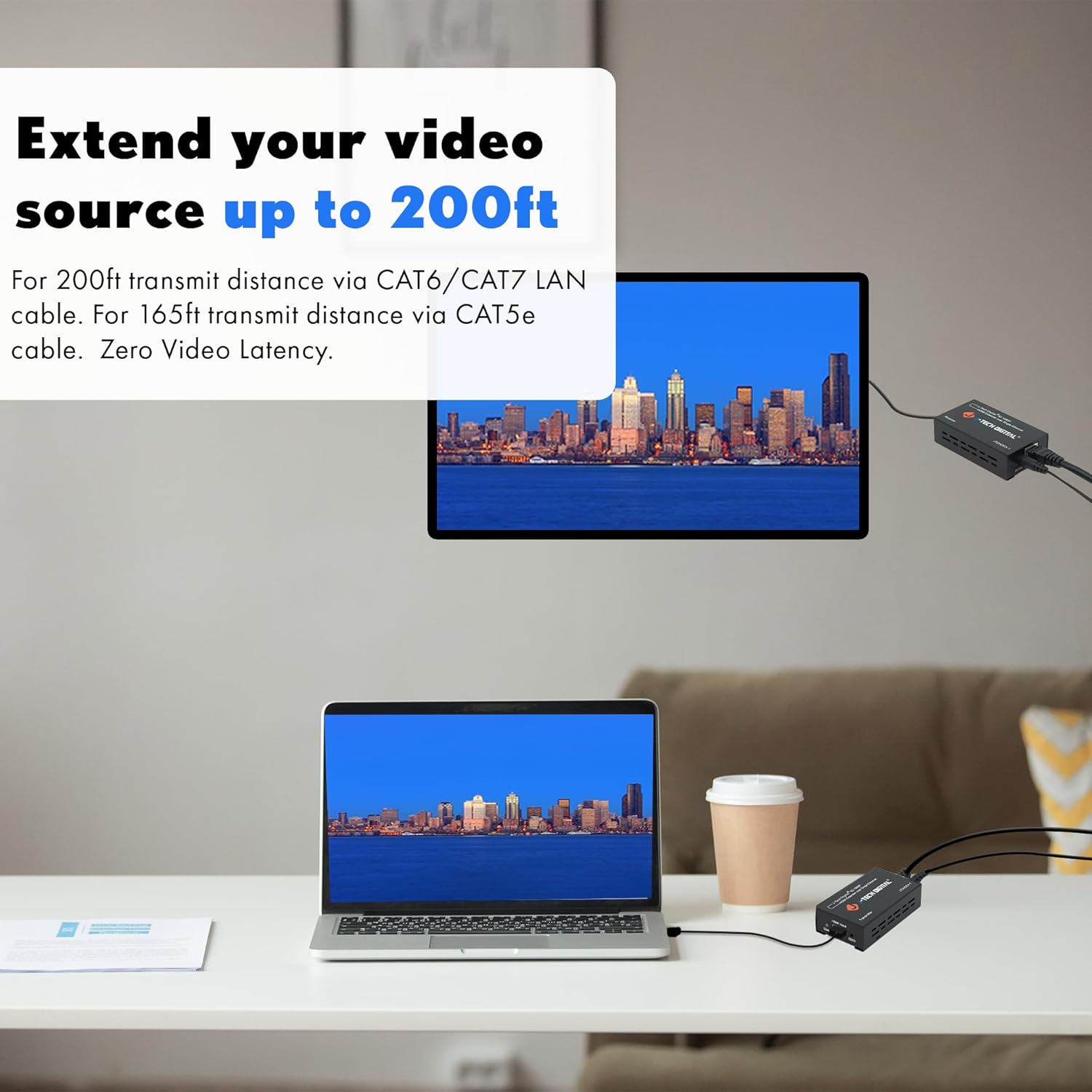 - ππππππ ππππ πππππ ππππππ ππ ππ 150π π - For 150ft transmit distance via CAT6/CAT7 LAN cable. For 165ft transmit distance via CAT5e cable. Zero Video Latency. NOTE: We recommend using direct HDMI to HDMI connections, avoid using signal converters or adapters at all costs.