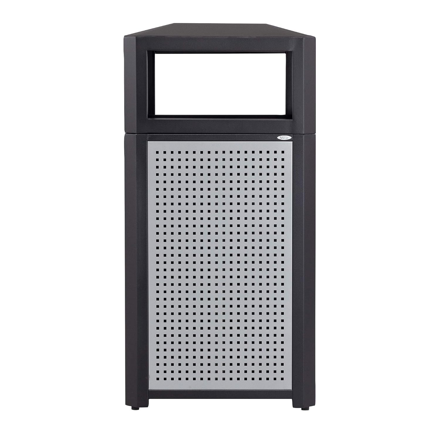 - MODERN STYLING. Evos Outdoor and Indoor Steel Trash Can features four stylish perforated panels on a heavy-duty steel frame with a galvanized base to resist rust and corrosion while keeping high traffic areas clean and litter free.