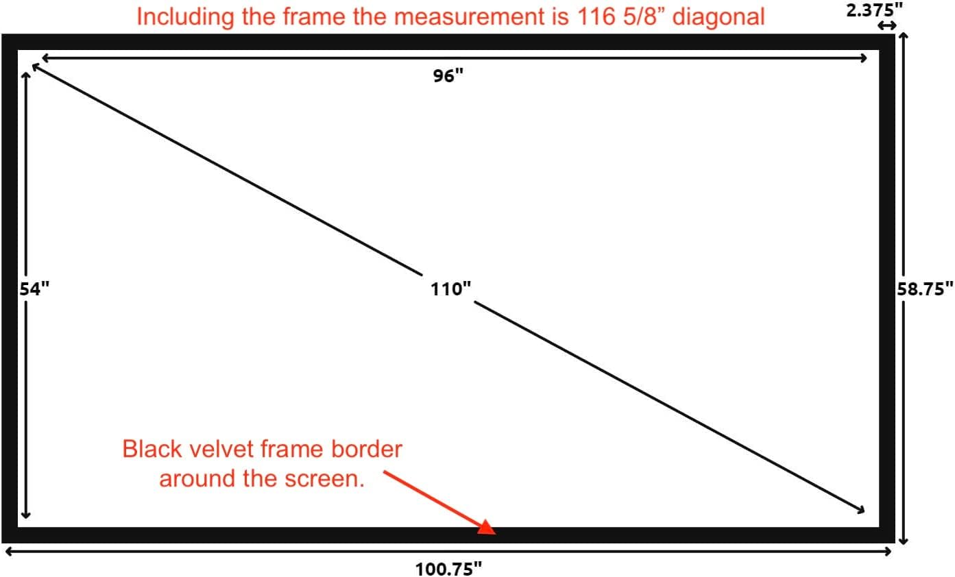 - Wall Mounted Fixed Frame Projection Screen (Overall Size 58.75" Tall x 100.75" Wide) (Viewing Area 110" Diagonal x 54" Tall x 96" Wide) No option for Legs or Stands with this product. Recommended for projectors with Native 16:9 Resolution