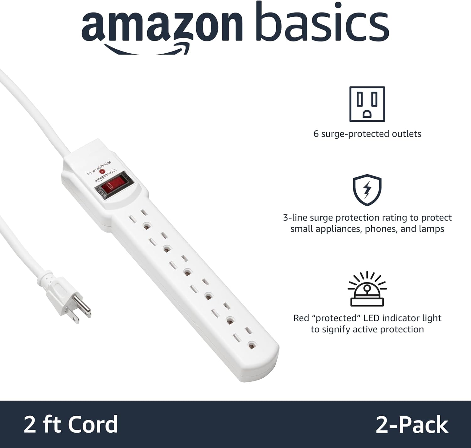 Amazon Basics Surge Protector Power Strip, 6-Outlet with 200J Protection, 2ft Extension Cord, Rectangle, White (2 Pack)