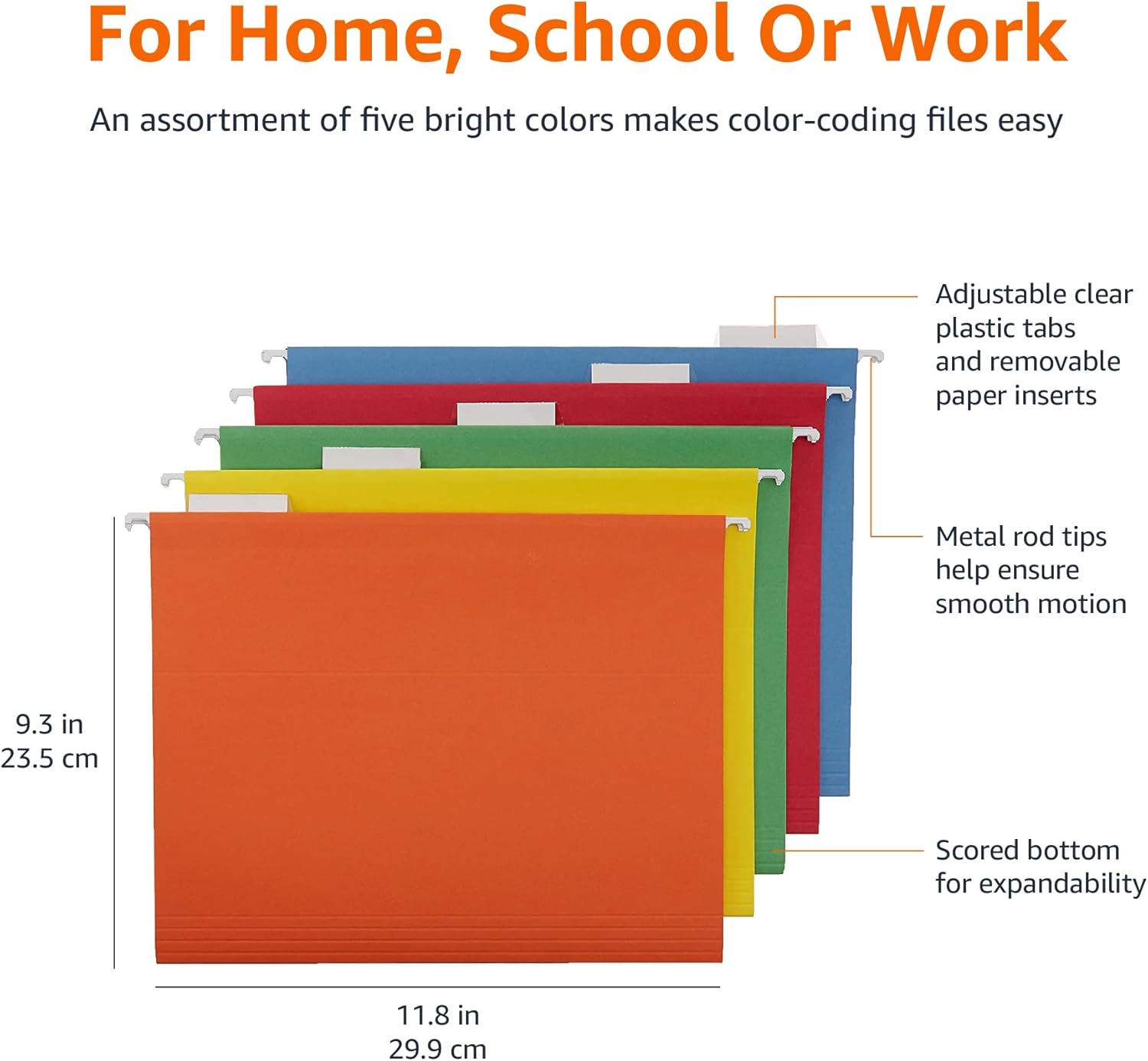 - 25 letter-size hanging file folders in assorted colors (5 each: Red, Orange, Yellow, Green, Blue); ideal for 8-1/2 x 11-inch documents