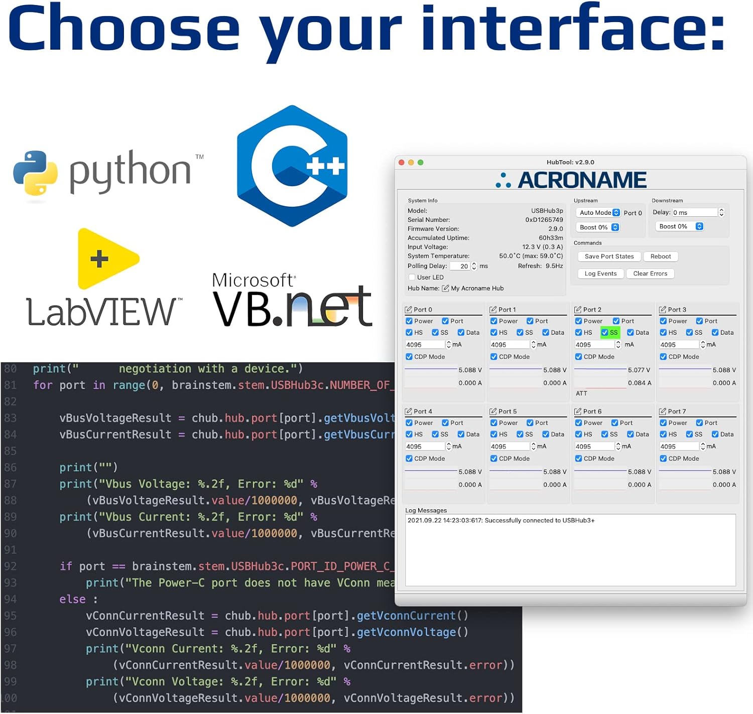 - Control and measure port voltage and current and data