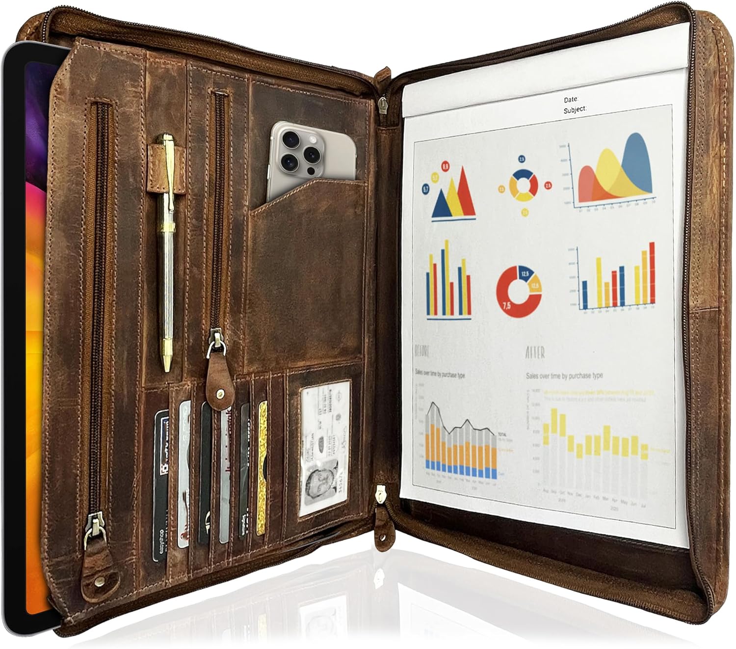 - √ VERSATILITY: Slim, Lightweight and Travel friendly, it contains small and large pockets fits upto 12 inch screen tablet/iPad , business card slots, pen holders and document protectors. Whether you need a notebook portfolio for presentations, client meetings, interviews, conferences, or just managing daily tasks—we’ve got you covered