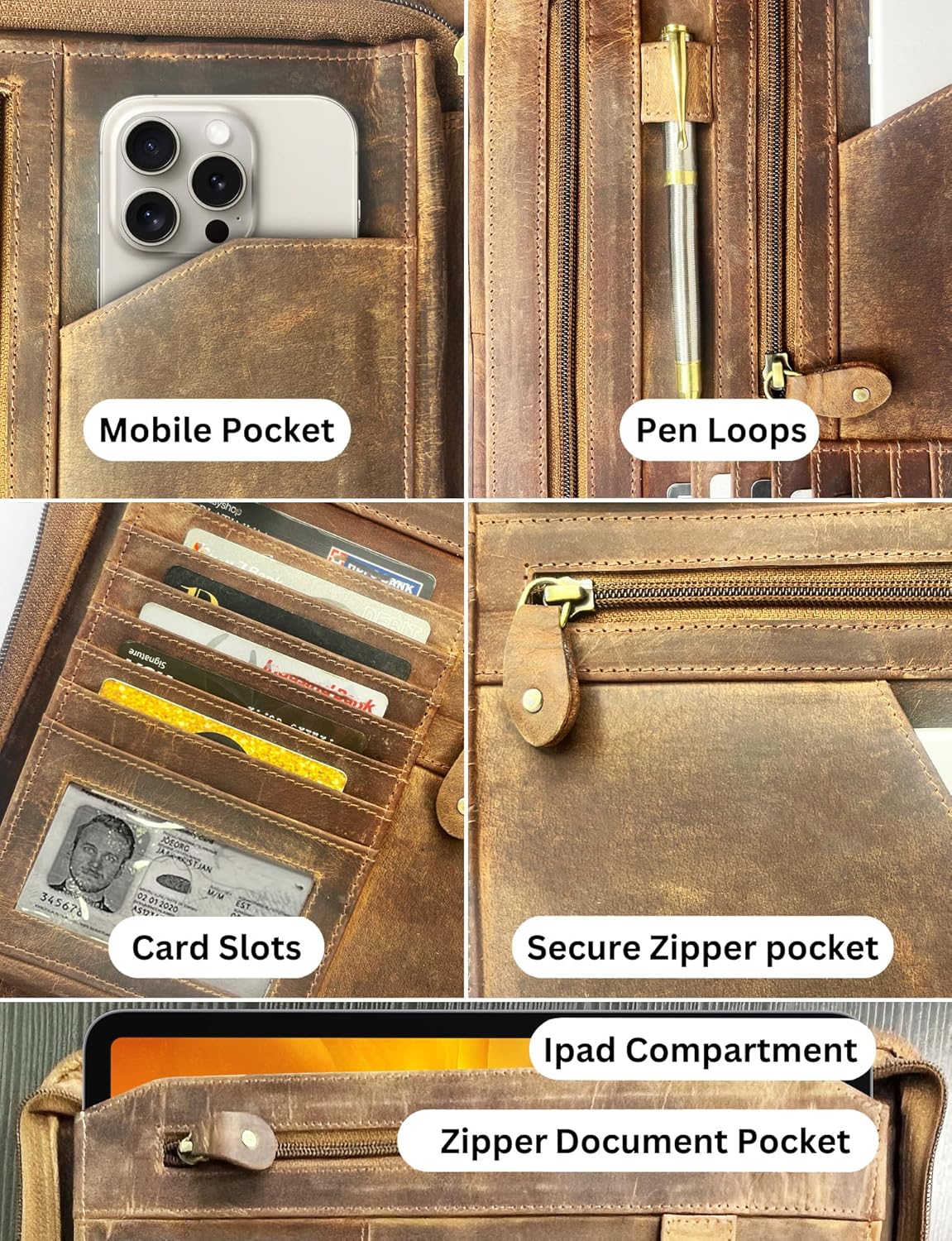 - √ DURABLE CONSTRUCTION AND EASY MAINTENANCE: It is equipped with thick hardbound cover and strong stitching with best quality material to ensure duribility of your leather portfolio. When it gets dirt or stain, wipe it with wet cloth or tissue simply. It looks new again