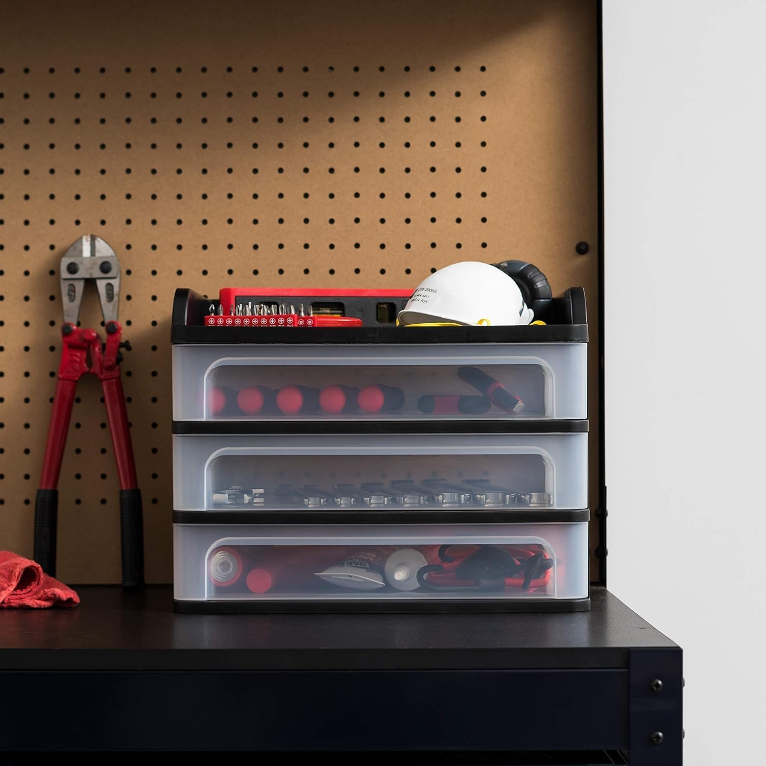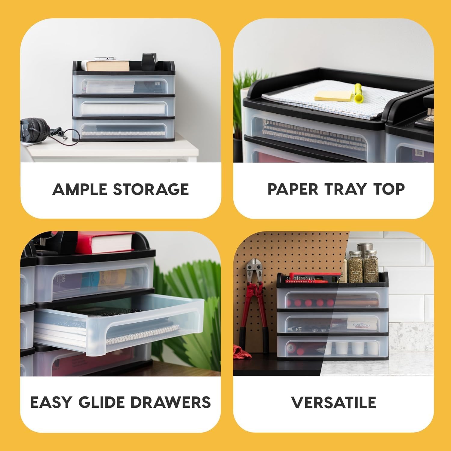 IRIS USA Plastic Desk Top 3-Drawer Storage Organizer with Paper Tray Top, 1-Pack, for Makeup Vanity Nail Polish Bathroom Stationery Art Craft Supplies Kitchen Office Garage Organization, Medium, Black
