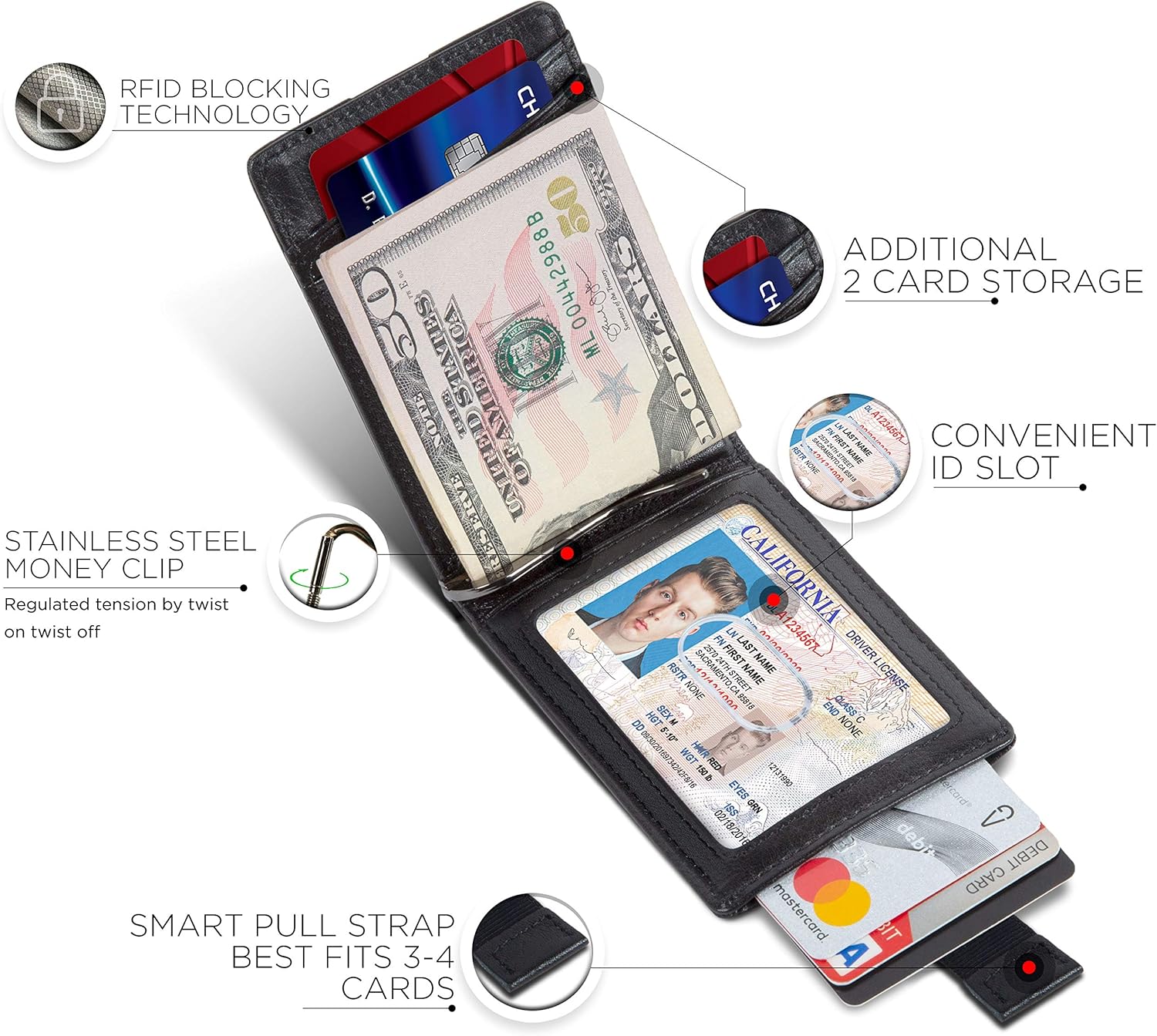 • SLIM AND STYLISH - Made with the Finest Full Grain leather, Top Grain Leather and Vegan Leather. Designed Quick Access ID Windows, Best Fits 6-8 cards plus US bills with no bulk, and a minimal Pull-tab design to reduce bulk - Wallet Size: 3.9" in. x 2.85" in. 0.5" in.