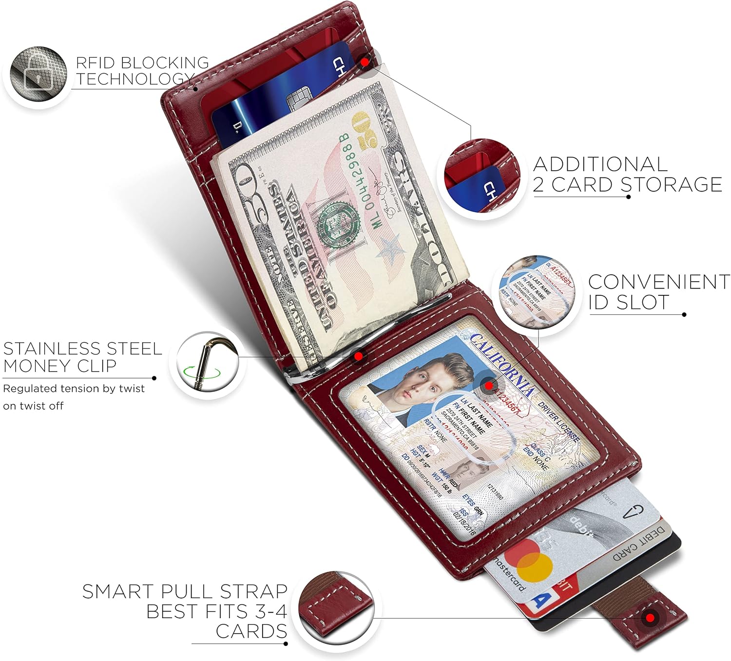 • SLIM AND STYLISH - Made with the Finest Full Grain leather, Top Grain Leather and Vegan Leather. Designed Quick Access ID Windows, Best Fits 6-8 cards plus US bills with no bulk, and a minimal Pull-tab design to reduce bulk - Wallet Size: 3.9" in. x 2.85" in. 0.5" in.