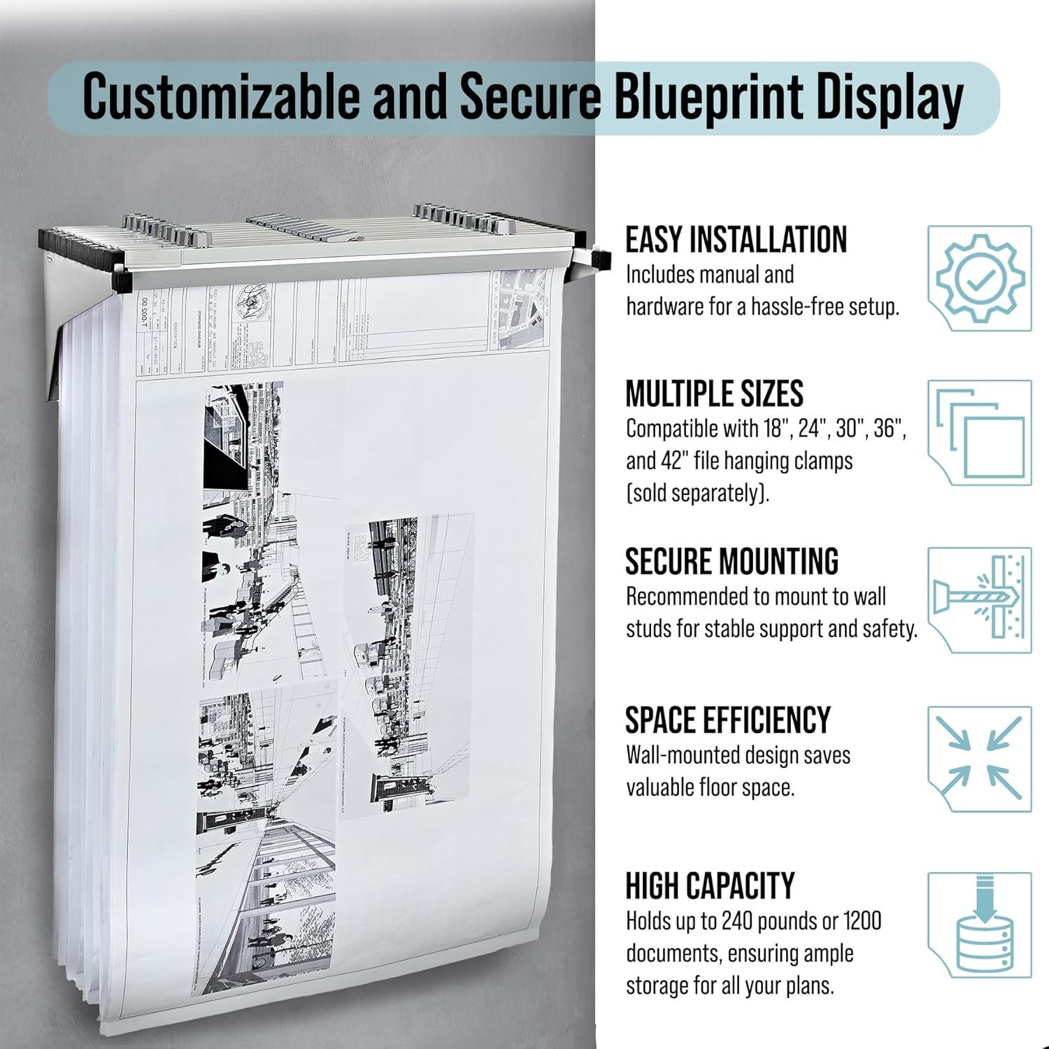 - Size & Colors: The blue print holders are available in five colors - black, white, blue, red, and beige. Compatible with 18", 24", 30", 36", and 42” file hanging clamps, this clamp wall holder can be tailored to your specific needs (clamps are sold separately by Adir Corp).