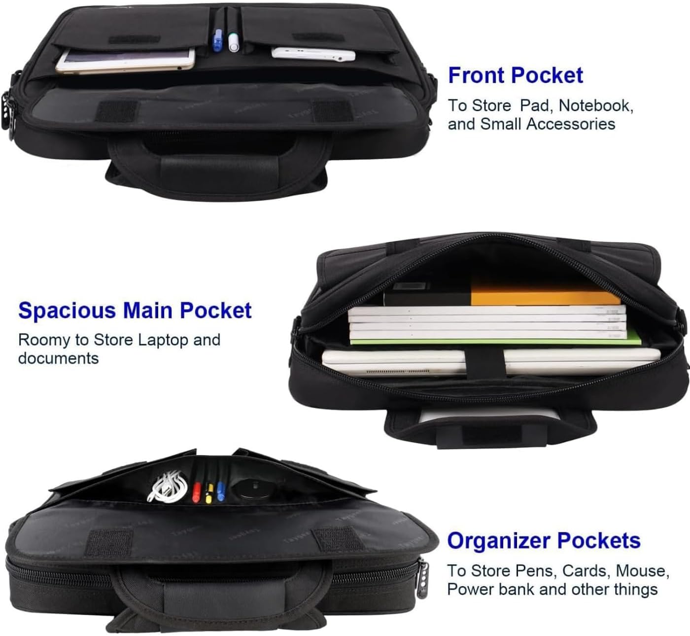 - Multi-Compartment Organizer: The computer bag includes external 2 pouches & 2 pencil pouches and inside several pouches in front large pocket under flap over, storage holders, documents, binder, power cords, mouse; 1 main zipper Pocket with foam padded sleeve fits most 15 15. 6 inch Laptop; back invisible zipper pocket for your valuables