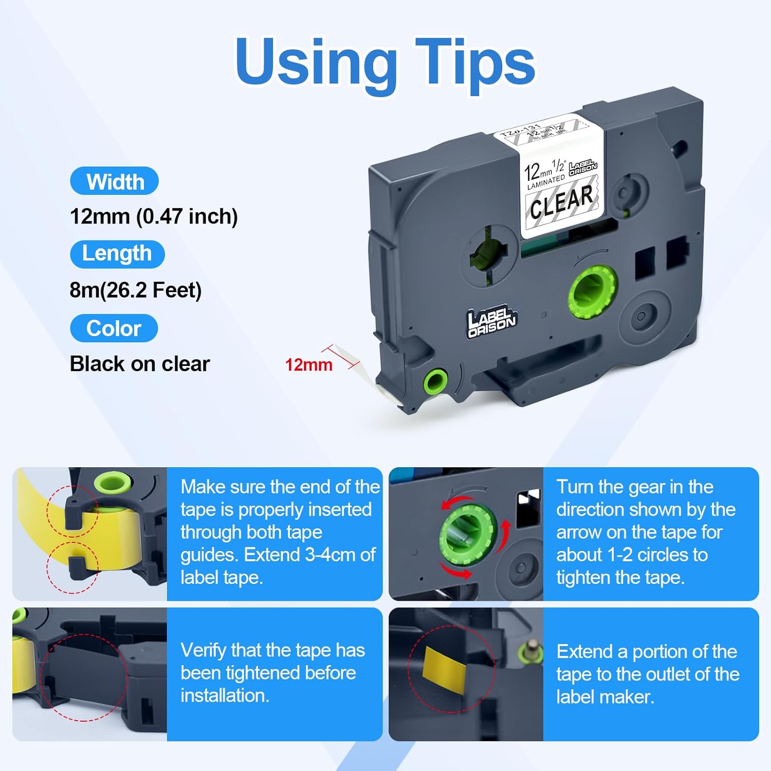 - Color & Dimension: Black on clear laminated label cartridge, 1/2 inch (12mm) width x 26.2 feet (8m)length, long lasting. 100% compatible for brother printers and no jam up your printers.