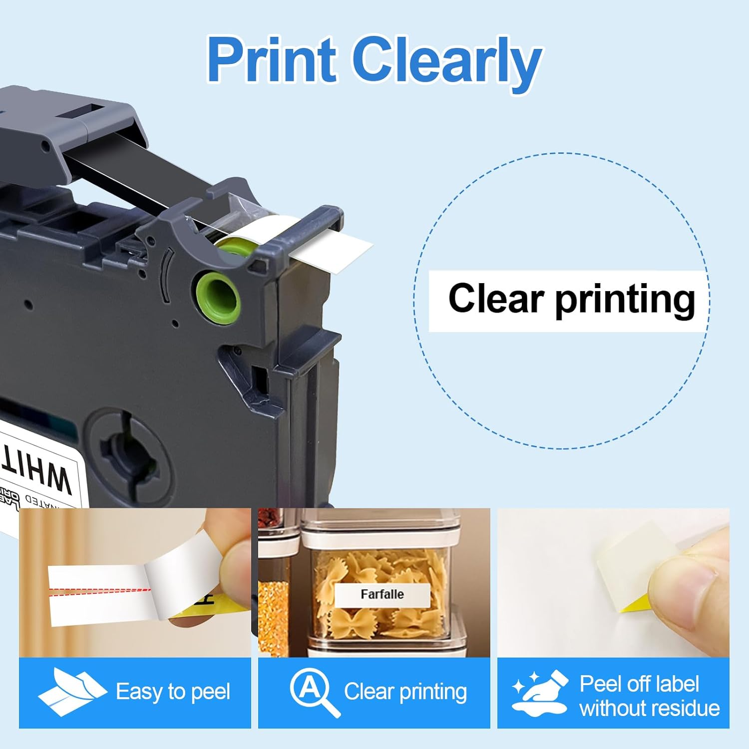 - Color & Dimension: P-touch tape laminated.Color:black on clear;Size:1/2 inch (12mm) widthx26.2 feet (8m)length,long lasting and smooth printing text.2rolls labeling tape packed in a box
