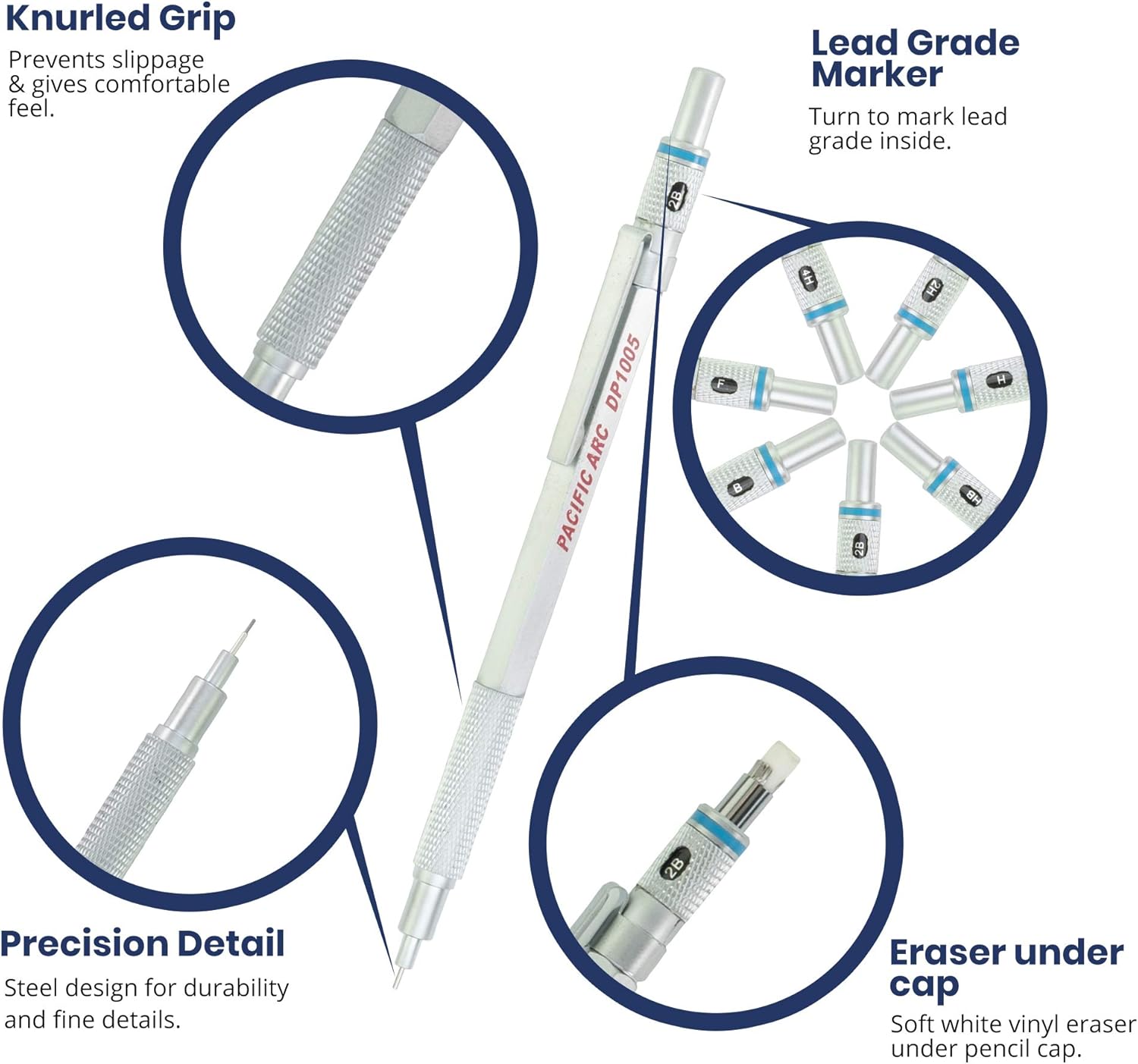 Pacific Arc Chromagraph Metal Mechanical Pencil .5 mm Silver Barrel Mechanical Pencil with Built In Lead Pencil Grade Indicator, Lead Pencil Holder for Drafting, Sketching, and Drawing
