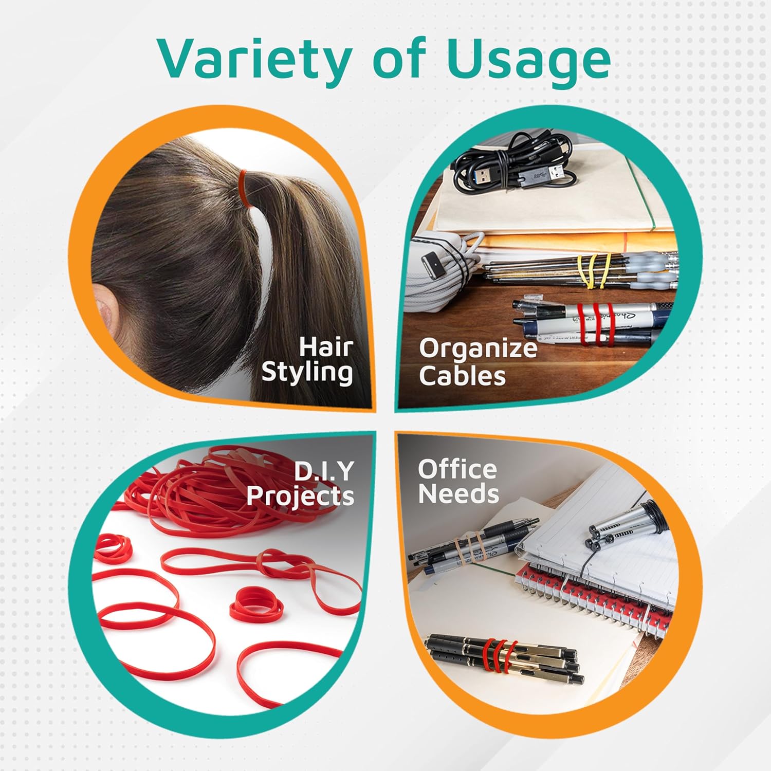 - Soft stretch: These rubber bands have a soft stretch making them comfortable to use and handle. Perfect for everyday use: Ideal for organizing papers and sealing bags at home or in the office.