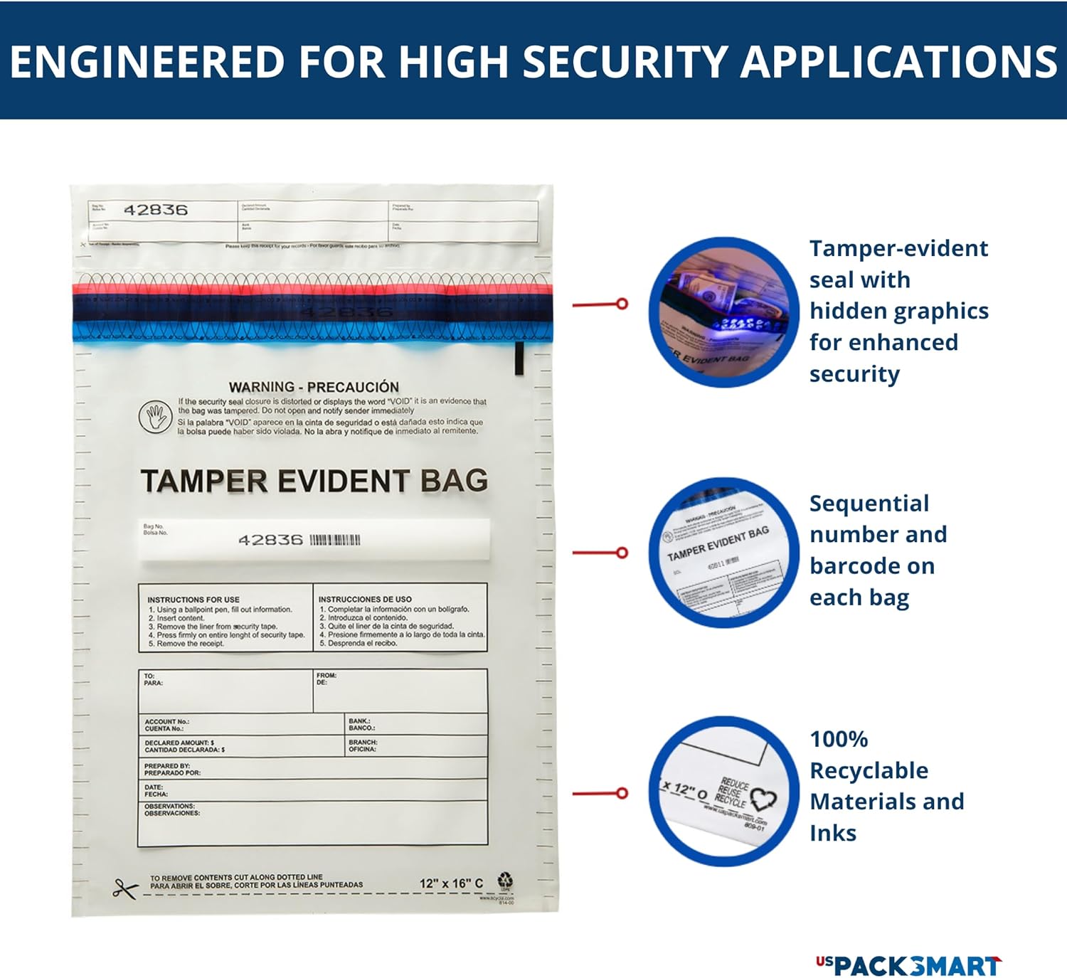 - ENHANCED SECURITY: These bags feature tamper-evident security tape with a user-friendly self-sealing adhesive design and discreet hidden graphics, ensuring effortless use and optimal safety. Additionally, the bags are designed with sequential numbers, barcodes, and a tear-off receipt to enhance security further.