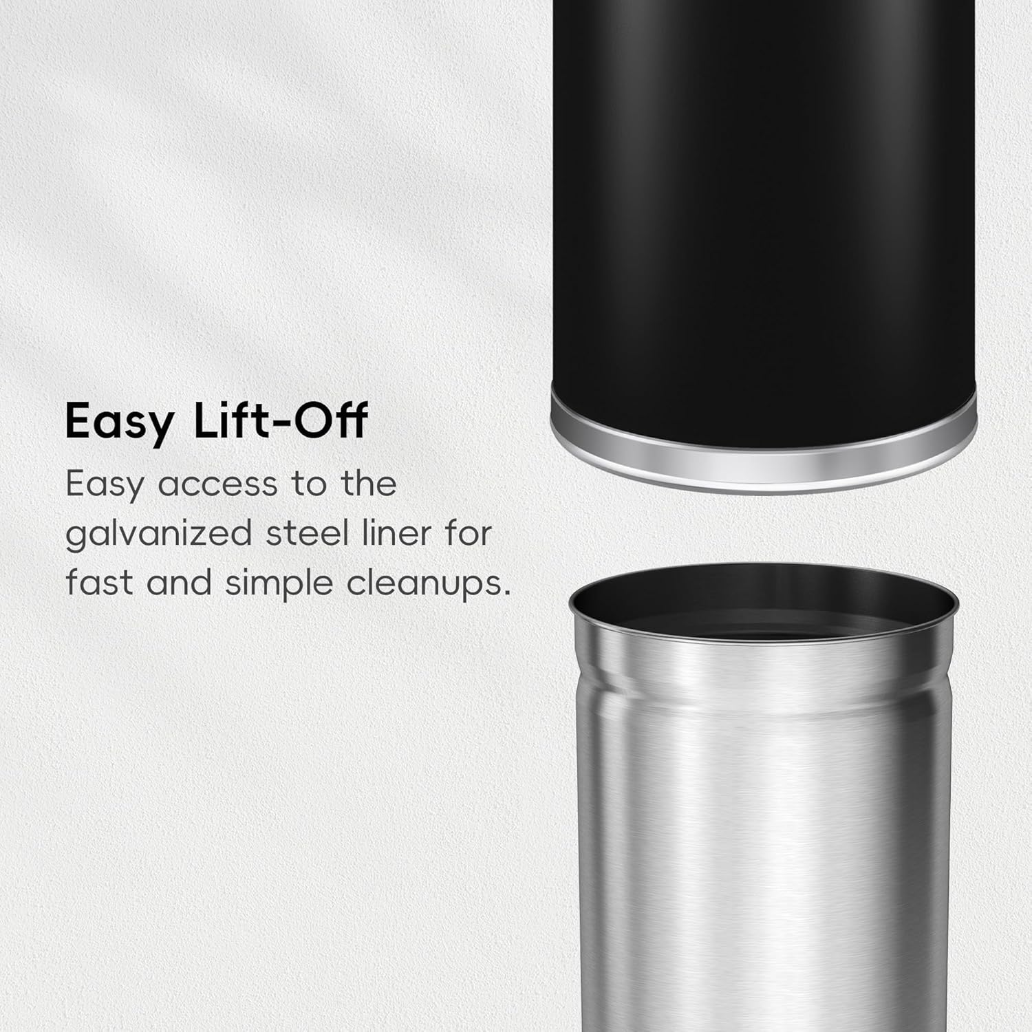 - Effortless Lift-Off: Outer shell easily removes to access the metal inner liner for quick bag changes while keeping excess trash bag and garbage out of sight.