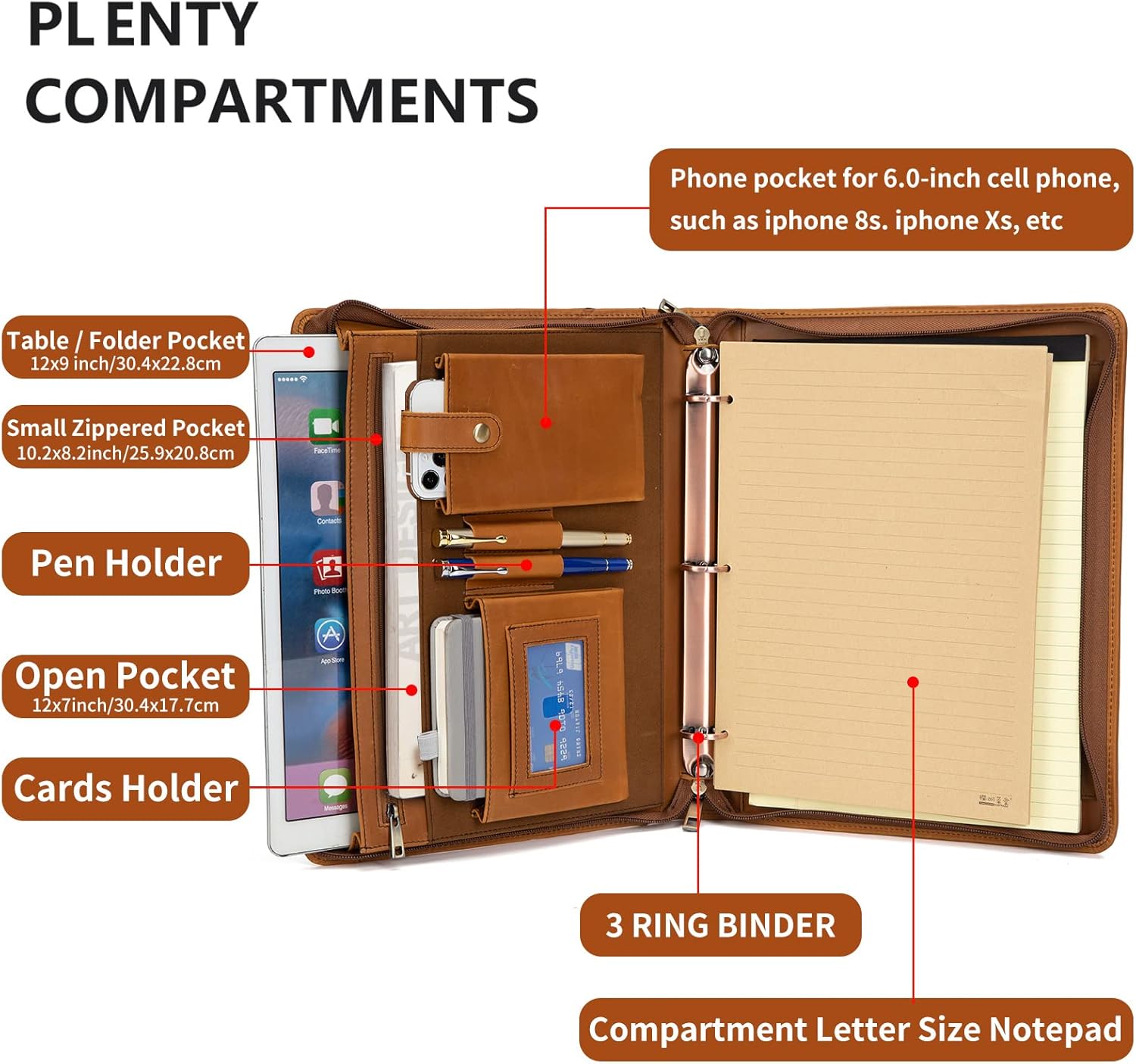 Professional Leather Business Padfolio Portfolio Case, 3 Ring Binder,Zippered Business Document Organizer Folder Tablet Pad Folio,with Letter Size Notepad (Brown Standard)