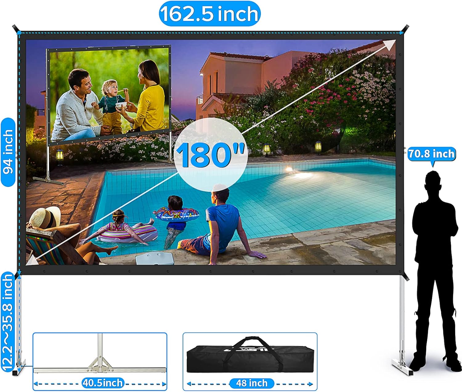 - ▶【Easy to Carry】- JWSIT 180-inch projector screen is made of lightweight but strong aluminum alloy, and the foldable screen frame can be easily carried anywhere with the included padded carrying bag. The 180-inch outdoor projector screen is folded more compactly than most 4K HD projector screens, so it is easy to carry, and suitable for outdoor large-scale events, commercial performances, and indoor large-scale conferences.
