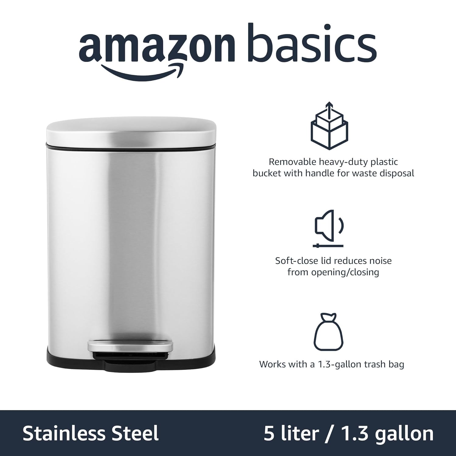Amazon Basics Smudge Resistant Mini Rectangular Trash Can With Soft-Close Foot Pedal, Brushed Stainless Steel, for Bathroom & small space, 5 L /1.32 Gal, Satin Nickel Finish, 7.3x8.5 x11.8 in (LxWxH)