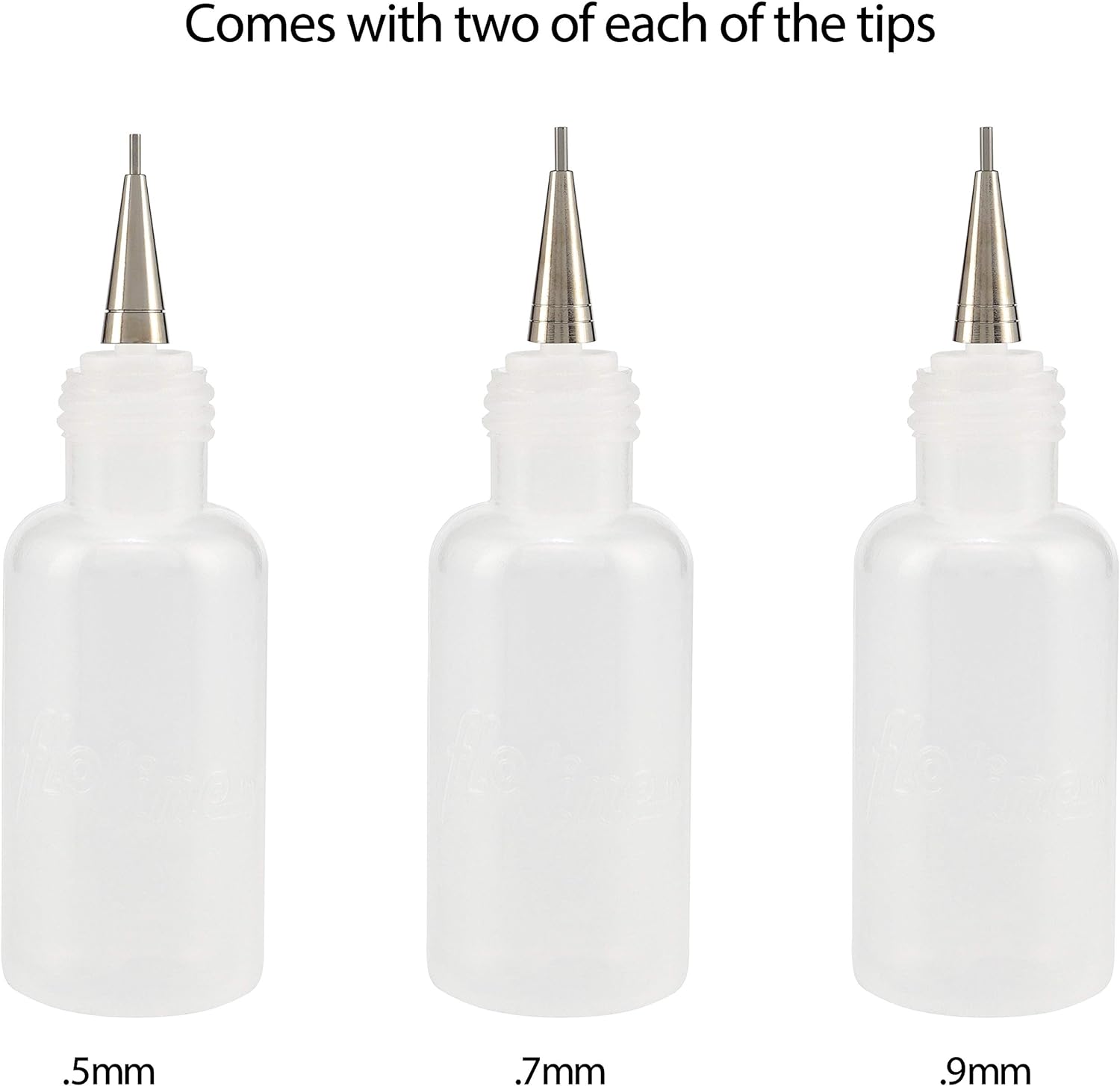 Flo Line Precision Tip Applicator Bottle - Fine Tip Squeeze Bottles for Fluid Media, Inks, Acrylics, Watercolor, Quilling, Paint Bottles with Tip Pack of 6 - 0.5oz bottles w/ 0.5, 0.7, 0.9 Metal Tips