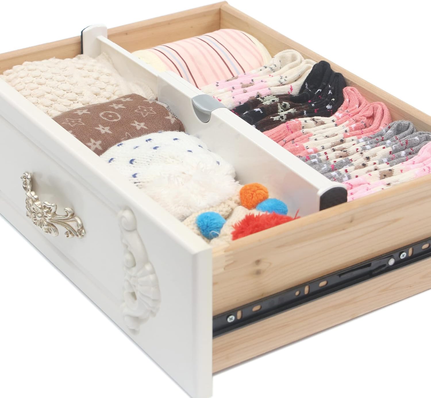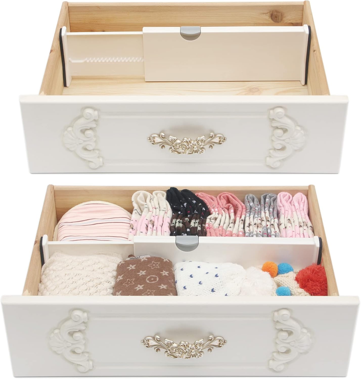 - Also can be used for drawer organizer, cabinet dividers partitions, desk drawer dividers, drawer separators, clothes, clothing, underwear, sock. Store and organize socks, women's leggings, sports bras, yoga pants, lingerie, tights, t-shirts, scarves, belts, accessories and more; The dividers expand to desired length and lock into place to keep everything situated; Customize your drawers to perfectly fit your storage needs.