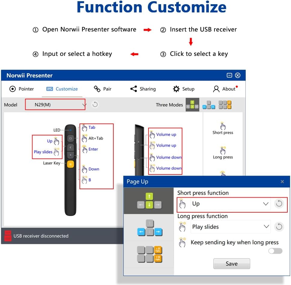 - Reprogrammable buttons: You can reconfigure the button functions to suit your individual needs using the Norwii Presenter software. Download the free software from Norwii Official