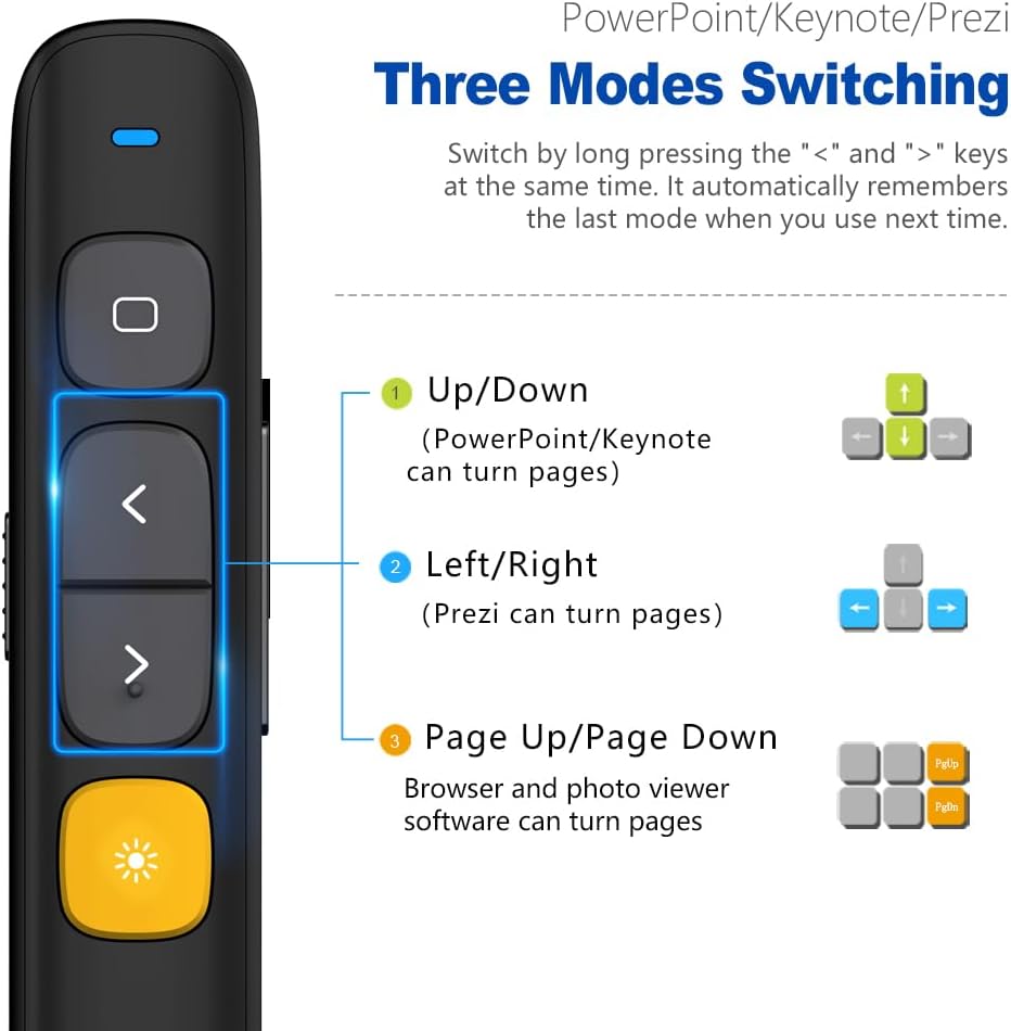 - Plug&Play and Wide Compatability: Simply plug the USB receiver into your devices like computer/laptop/ipad, Then you can start. The presentation clicker supports leading presentation software include PowerPoint, Prezi, Keynote, Google Slides, Propresenter, MediaShout and more, works in Windows, macOS, Android, Linux system