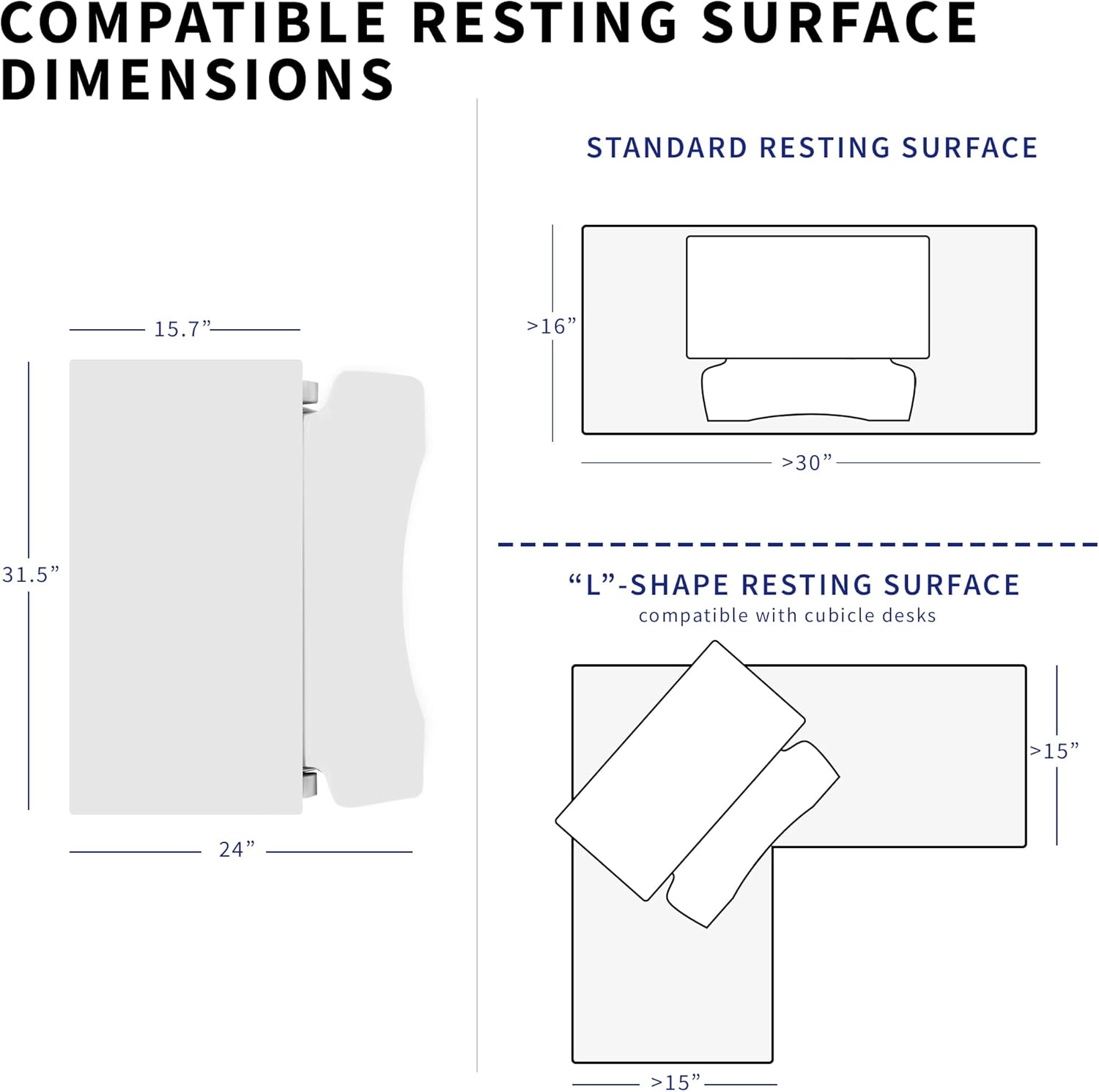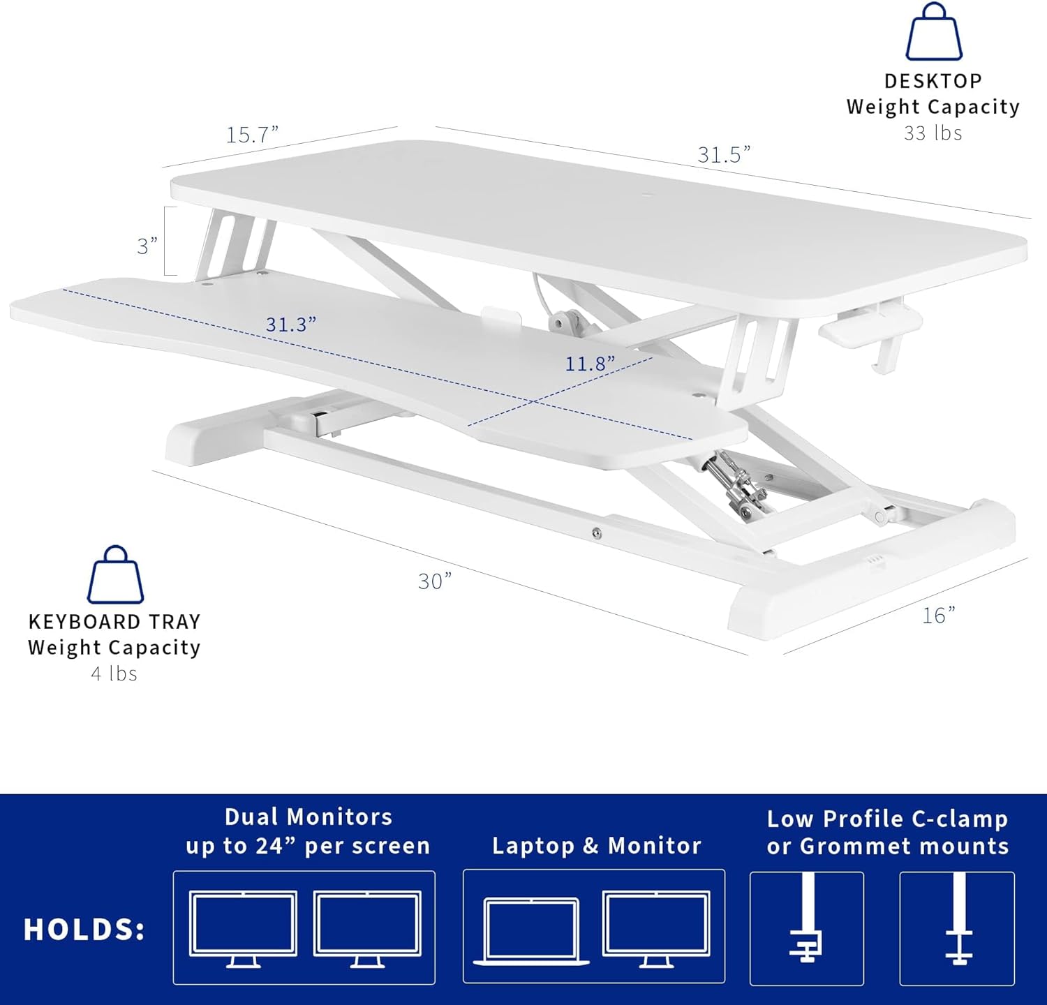 - Space Efficient 31.5" Surface - The top surface measures 31.5" x 15.7", which maximizes space while still providing room for dual monitors. The 31.3" x 11.8" (10.5" in center) keyboard tray raises in sync with the top surface to create a comfortable workstation.