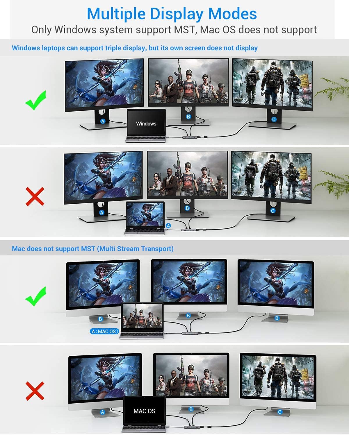 - Massive Docking Station: Please make sure that your laptop Type C port support DisplayPort Alt Mode and Power Delivery. Only mirror display for macOS system. The usb c hub is incompatible with the USB-A to USB-C Adapter.