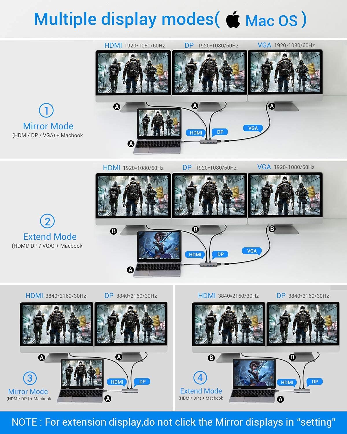 - Triple Display for Windows: Only support the Triple display for Windows(including laptop display). 3840x2160 output only available when using HDMI or DP display or mirror the three displays. In extend mode, each will be limited to a maximum resolution of 1080P.