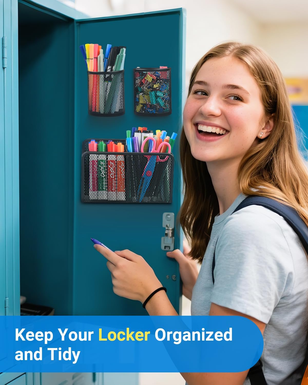 - Our pen holders are made of durable metal mesh and strong magnets. Large capacity for classrooms school office kitchen supplies. It is good idea for whiteboards lockers refrigerators desks and pegboards organization for school accessories pencils, markers, pens, drawing tools, clips, erasers, and more.