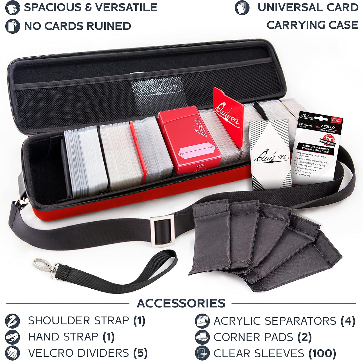 - Deck Box Card Storage Case: The Quiver trading card deck case large capacity cases will fit up to 9 deck boxes, has a convenient mesh pocket to safely store accessories, cushioned corner pads to protect your cards against bending.