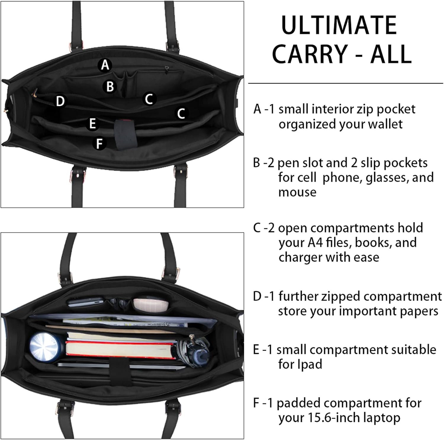 - Roomy Compartment Computer Bag for Women:Laptop bag divided into three sections.One main padded pocket design for 15.6 inch(included 13/14 inch) laptop with a thick padded foam section, two open big pockets perfect for your A4 documents and books, one large zipped pocket for your personal stuff, one iPad pocket, two slot pockets, and two pens pocket, and one small zipper pocket for your files, a wallet, sunglasses, a phone, makeups and so on.