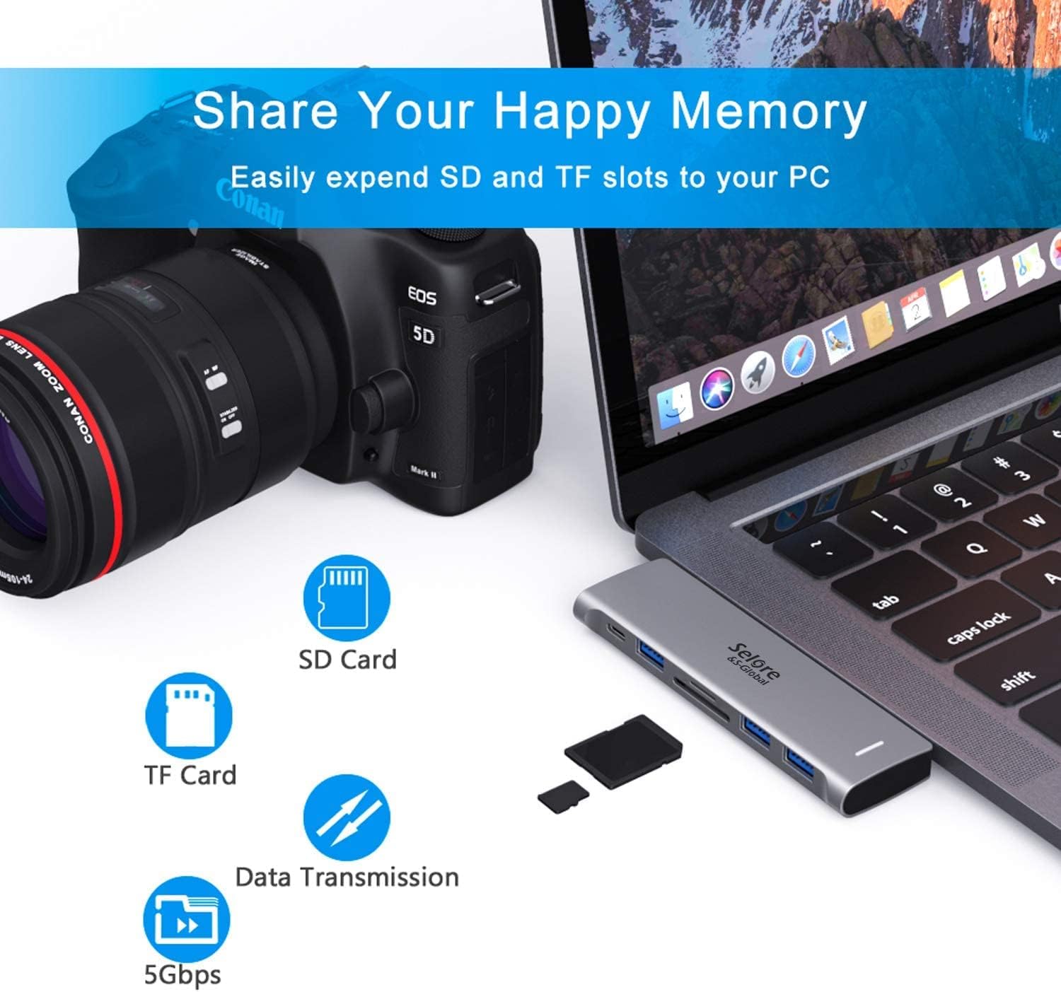 - USB C Hub Adapter for MacBook Pro/Air 6-IN-1: This Macbook pro Adapter is specially designed for MacBook Air 13"(Retina) and MacBook Pro 13"/ 13"(Touch Bar)/ 15"(Touch Bar); (Note:this USB C Dongle can't work with Macbook pro Case); Mac usb adapter features 100W Thunderbolt 3 port, 3 USB 3.0 ports, and SD/Micro SD card reader, expand your MacBook's capabilities simply