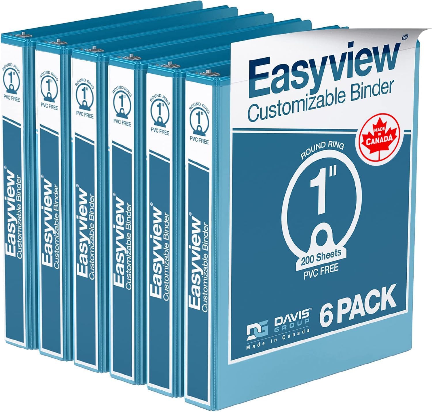 Easyview Premium 3-Ring Binders with Clear-View Covers and Round Rings, Binders for School or Office, 1 Inch, Pack of 6, Turquoise