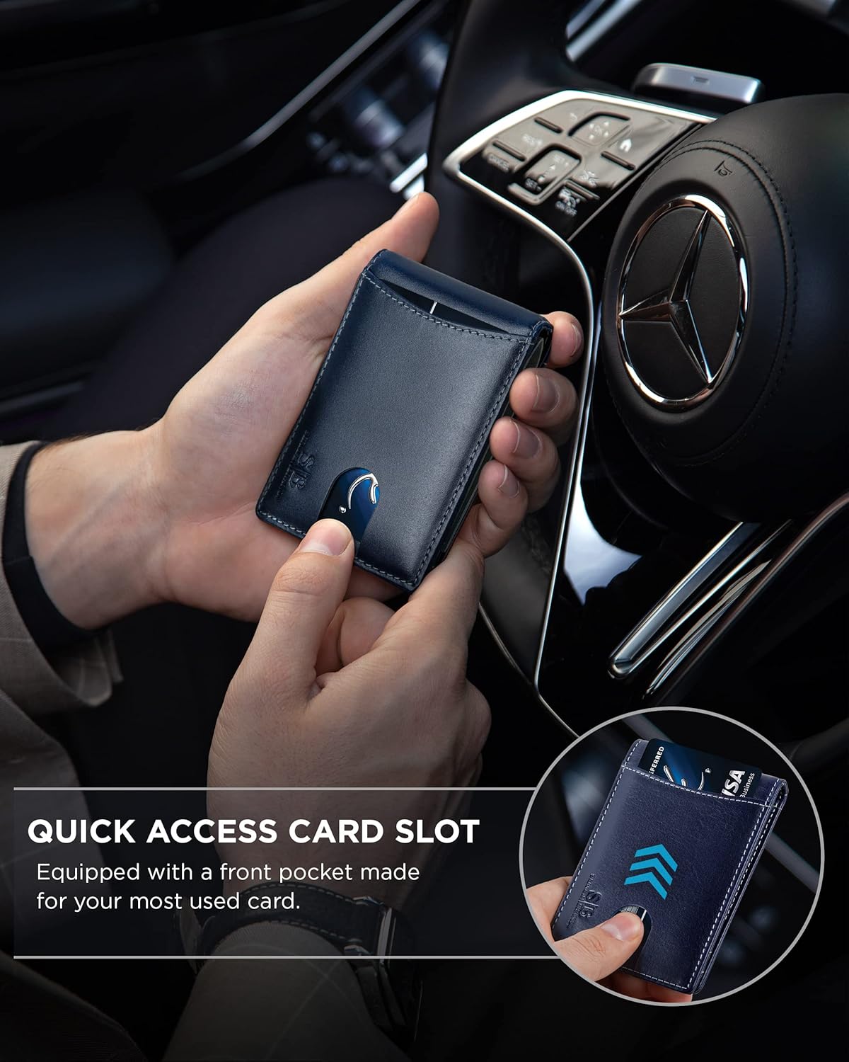 - SLIM AND STYLISH - Made with the Finest Full Grain leather, Top Grain Leather and Vegan Leather. Designed Quick Access ID Windows, Best Fits 6-8 cards plus US bills with no bulk, and a minimal Pull-tab design to reduce bulk - Wallet Size: 3.9" in. x 2.85" in. 0.5" in.