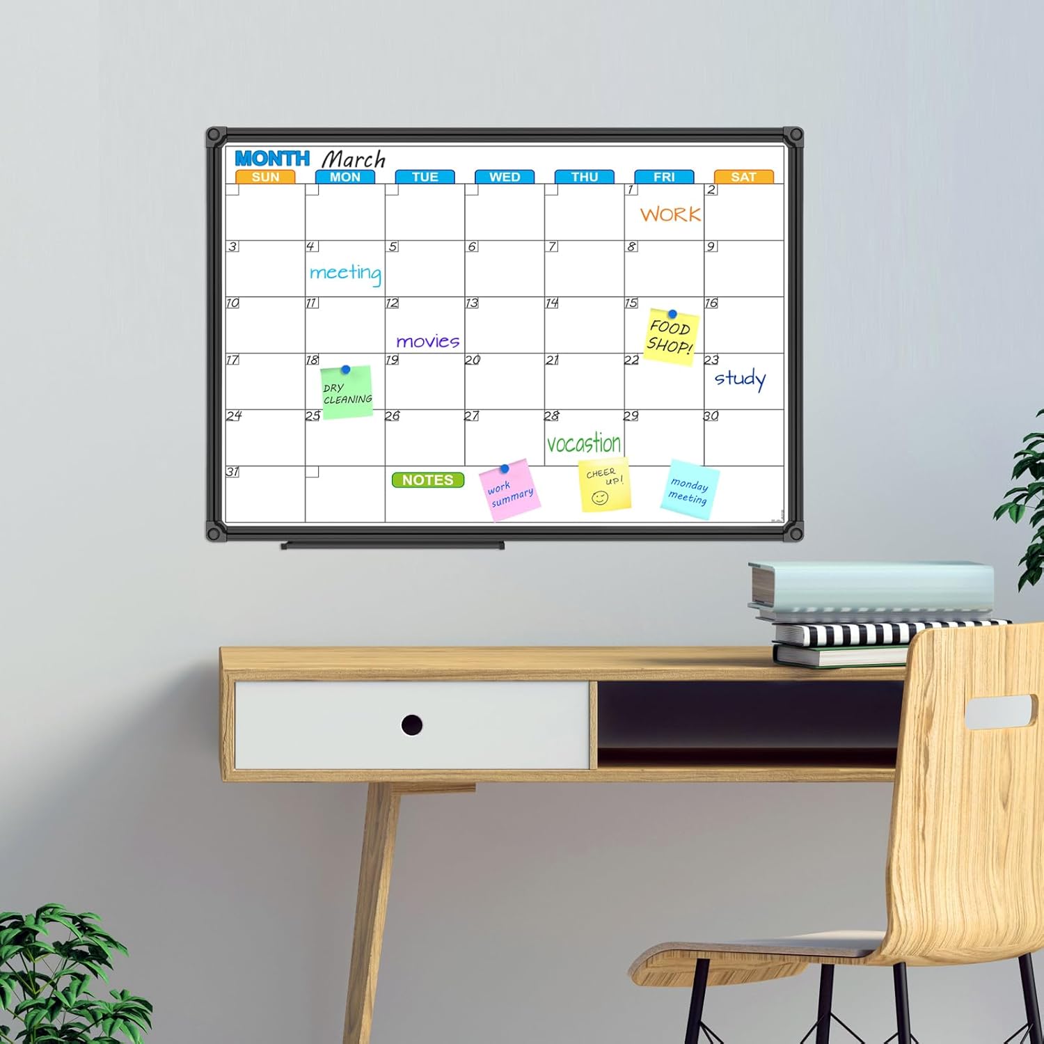 JILoffice Dry Erase Calendar Whiteboard - Magnetic White Board Calendar Monthly 24 X 18 Inch, Black Aluminium Frame Wall Mounted Board for Office Home and School