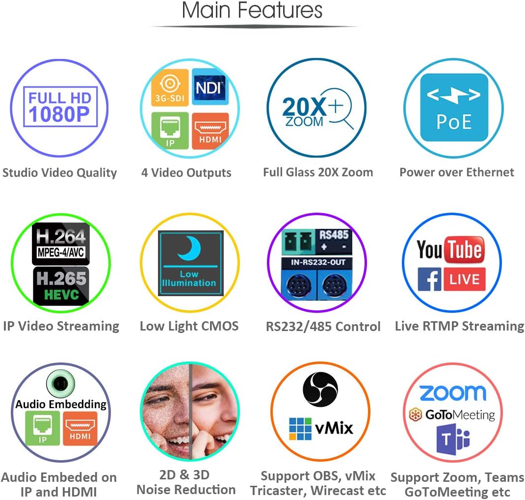 - 🌟AVKANS NDI CAMERA WITH 20X ZOOM LENS🌟 - Broadcasting NDI PTZ Camera with 3G-SDI /HDMI /IP /NDI/ USB3.0 for Live Streaming and Video Recording. PTZ Camera 20x NDI camera for House of Worship, Church, School, Hospitcal, Live Event, Live Streaming, Broadcasting and Studio. PoE supported.