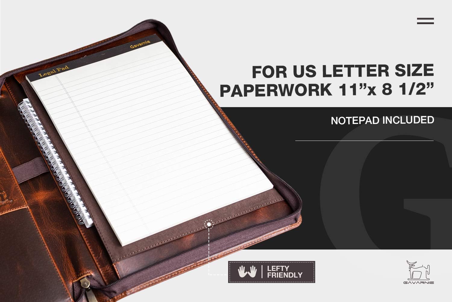 - GENEROUS PAPERWORK STORAGE. This leather padfolio for men designed for the standard US letter-sized 11”x 8 1/2” sheets, The organ pocket holds a big 1/2" stack of loose papers without tearing up the pages or folding them. The leather folder portfolio with notepad to fit right or left-handed users. This business leather portfolio organizer goes over well with most business people or students.