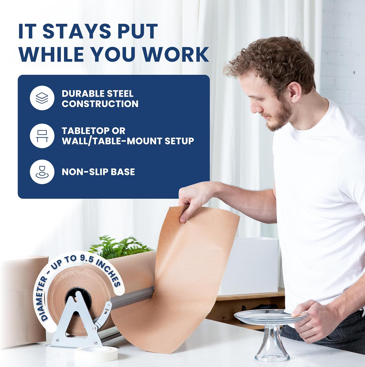 - Roll Compatibility: Fits rolls up to 24'' wide, max 9'' diameter (equivalent to 1000ft on a 1'' core). Be sure to insert your paper with the loose end over the top; butcher paper, construction paper, brown paper, or craft paper may be used
