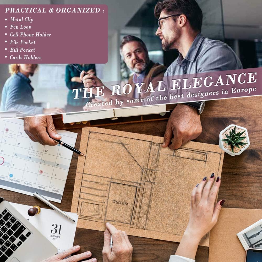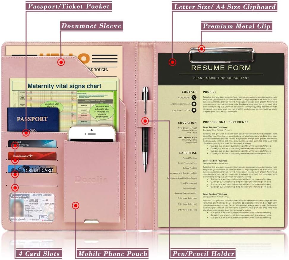 - [PRACTICAL & ORGANIZED] Darolin padfolio portfolio case designed with one metal clip, pen loop, cell phone holder, file pocket, bill pocket and 4 card holders. Various inside pockets and slots capable of holding documents, letters, notes, envelopes, mobile phone, pens, business cards and other stuffs, which facilitate your daily use and business travels, make your work or study more efficient.