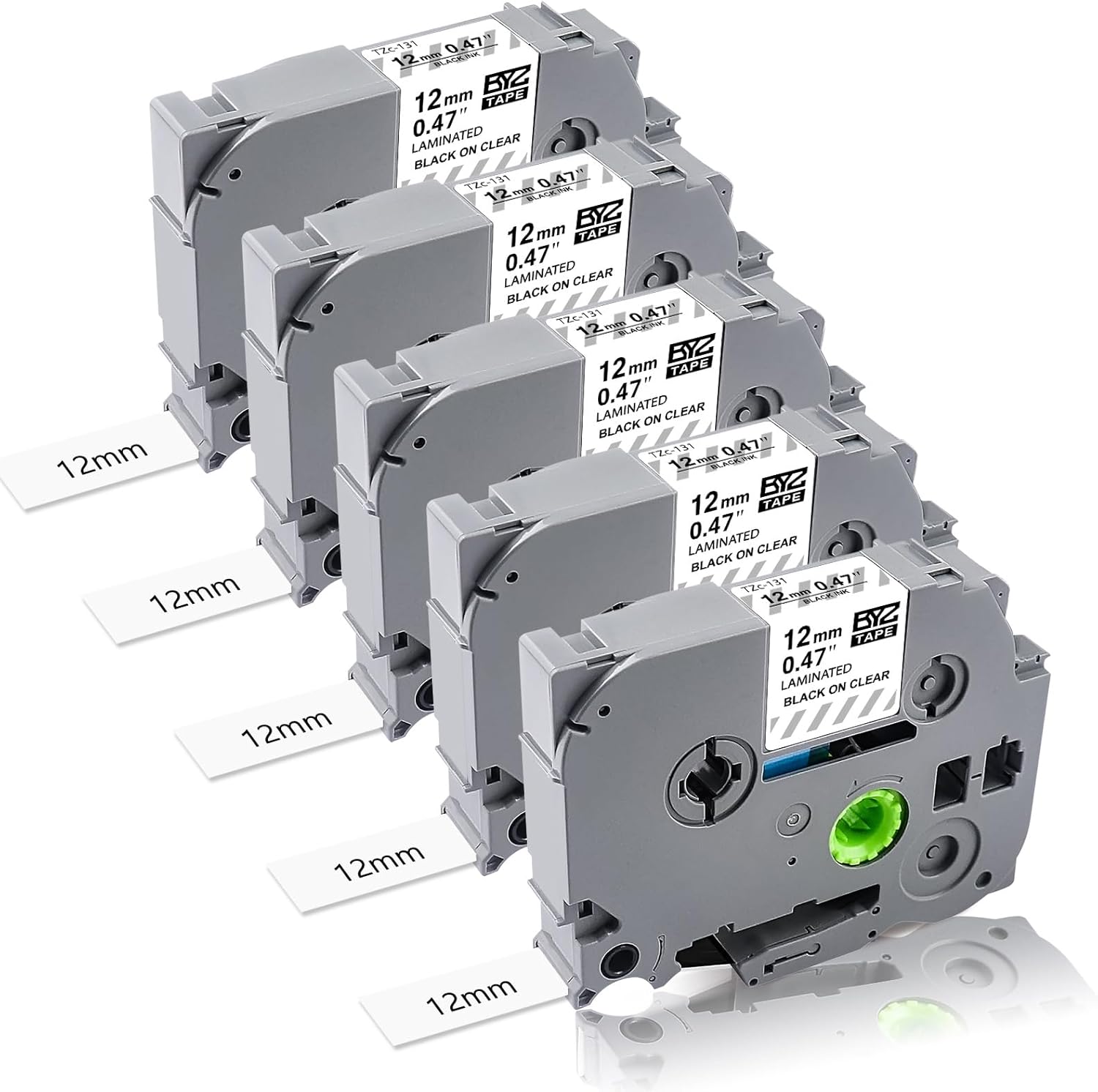 - Package Include: 5-pack label maker tape compatible with brother tze tz tape tze-131 12mm laminated clear. Color: Black print on Clear tape. Width: 1/2inch(12mm). Length: 26.2ft(8m).