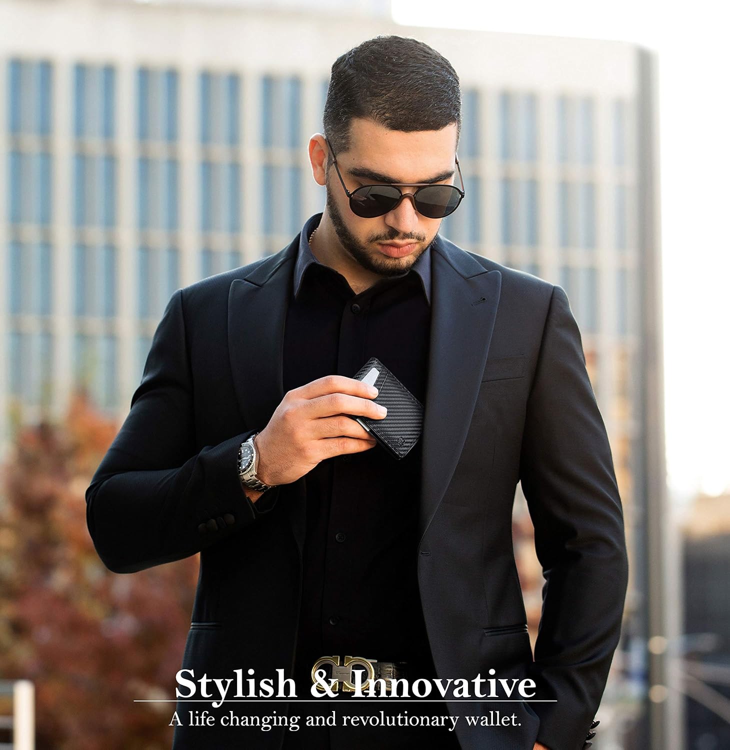 • Slim your Pocket - This slim wallets for men reduces bulk with an efficient minimalistic design that makes everything easier. Best fits up to ten credit cards, an ID plus bills. Total of 11 available card slots including two secret pockets. Perfect for carrying debit, credit and all other cards. Store cash using the innovative stainless- steel money clip. Wallet Size: 4.3 inches x 3.1 inches