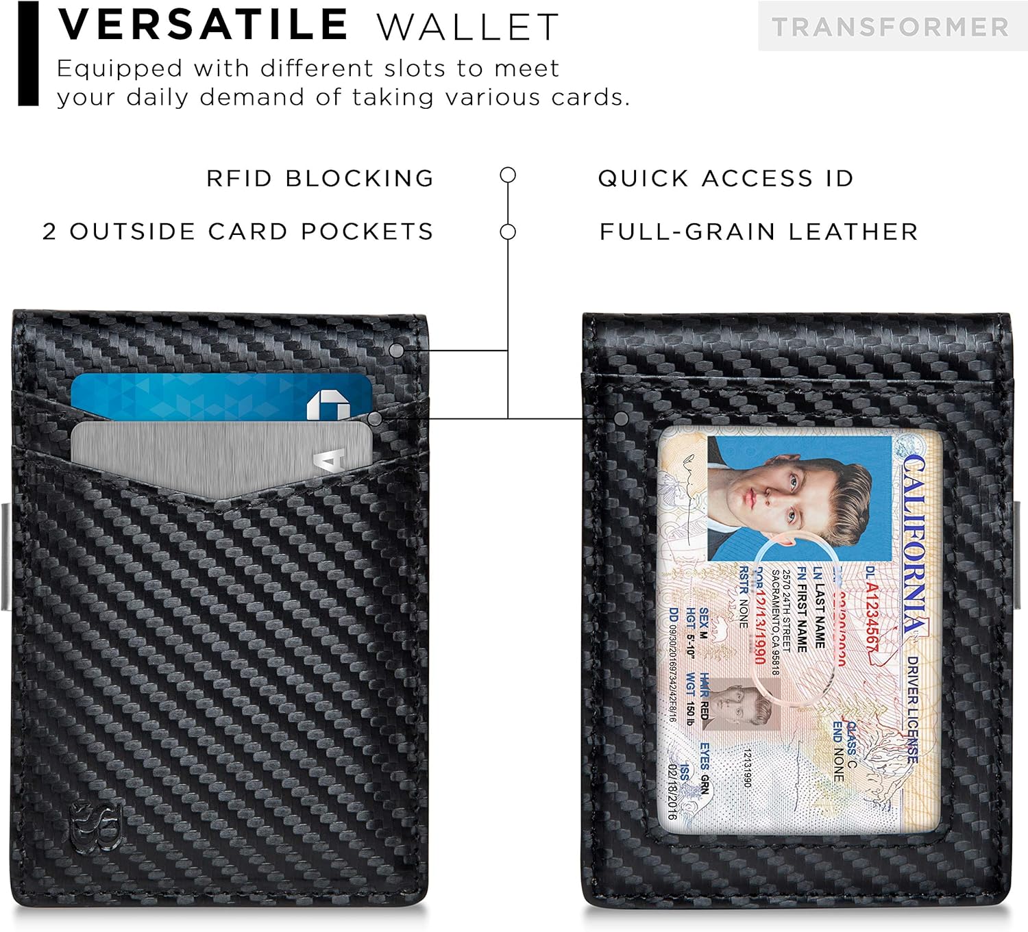 • Stylish & Practical - Functionality at its Best. A wallet that will meet your everyday needs and fits in your pocket without bulging. Two convenient outside card slots made for your most used cards, instantly have the cards you need to save time and energy. Photo ID slot located on the outside of the wallet, a smart solution to instantly access your ID. Innovative stainless steel money clip securely holds up to 15 bills, quick payments and organization made easy