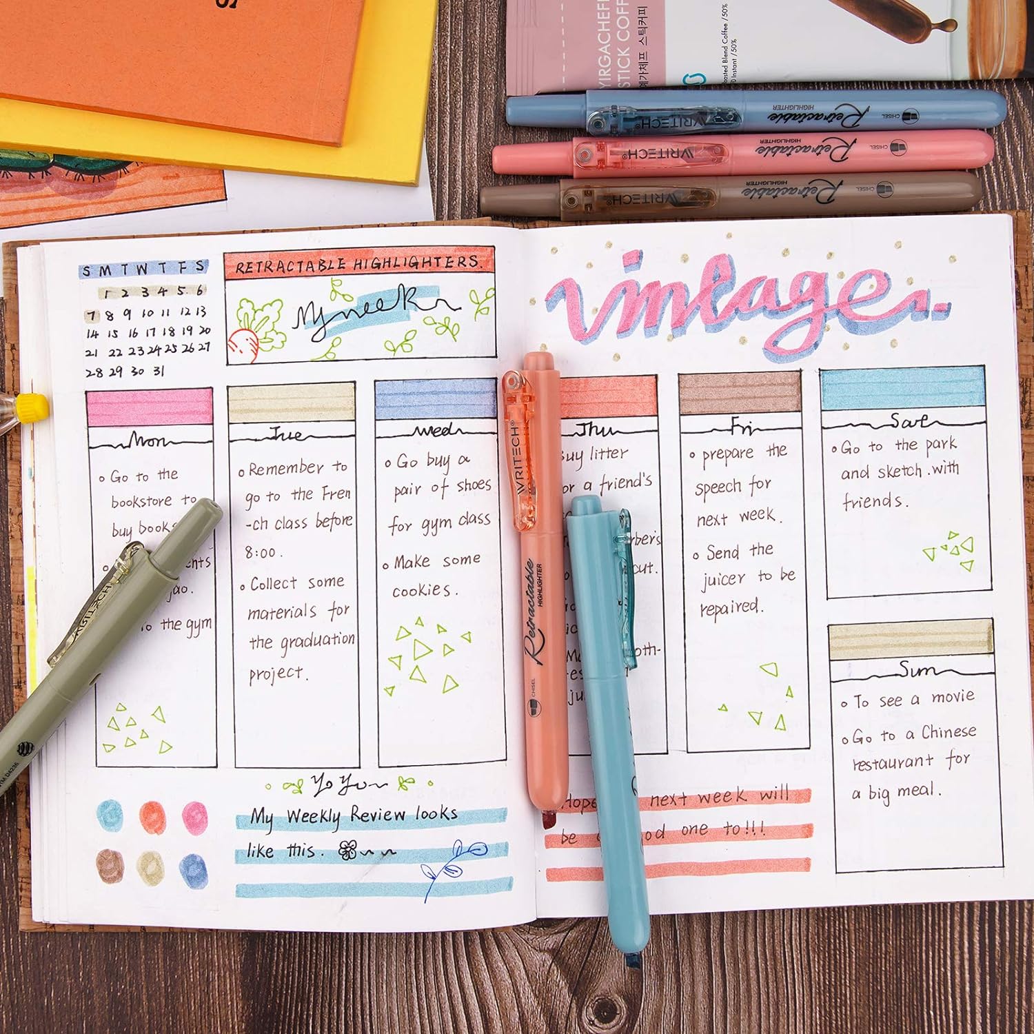 WRITECH Retractable Highlighters Assorted Colors: Chisel Tip Click Aesthetic Highlighter Marker Pens Pack Multi Colored Ink No Bleed Smear for Highlighting Journaling (6ct Vintage)