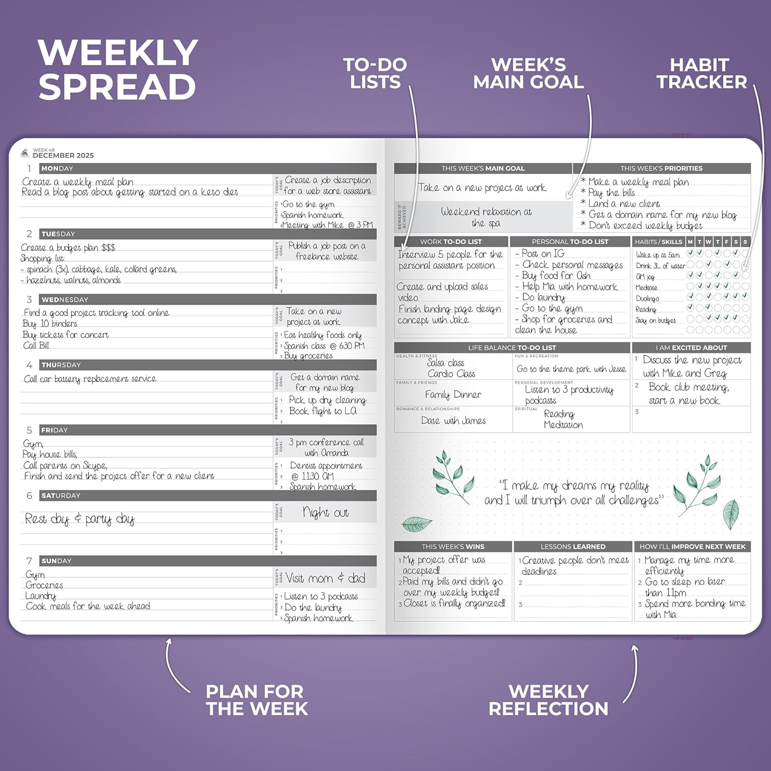 - PLAN YOUR LIFE TO THE TINIEST DETAIL – Convenient large-format layouts include weekly and daily priorities, to-do lists, habit trackers, monthly calendars and progress reviews to help you plan each aspect of your busy life.