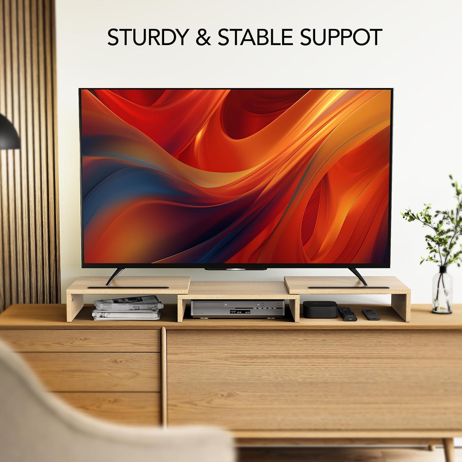 AMERIERGO Dual Monitor Stand Riser- 3 Shelf Screen Stand with Adjustable Length and Angle, 2 Extra Functional Slot Desktop Organizer Stand for PC, Computer, Laptop (Light Wood)