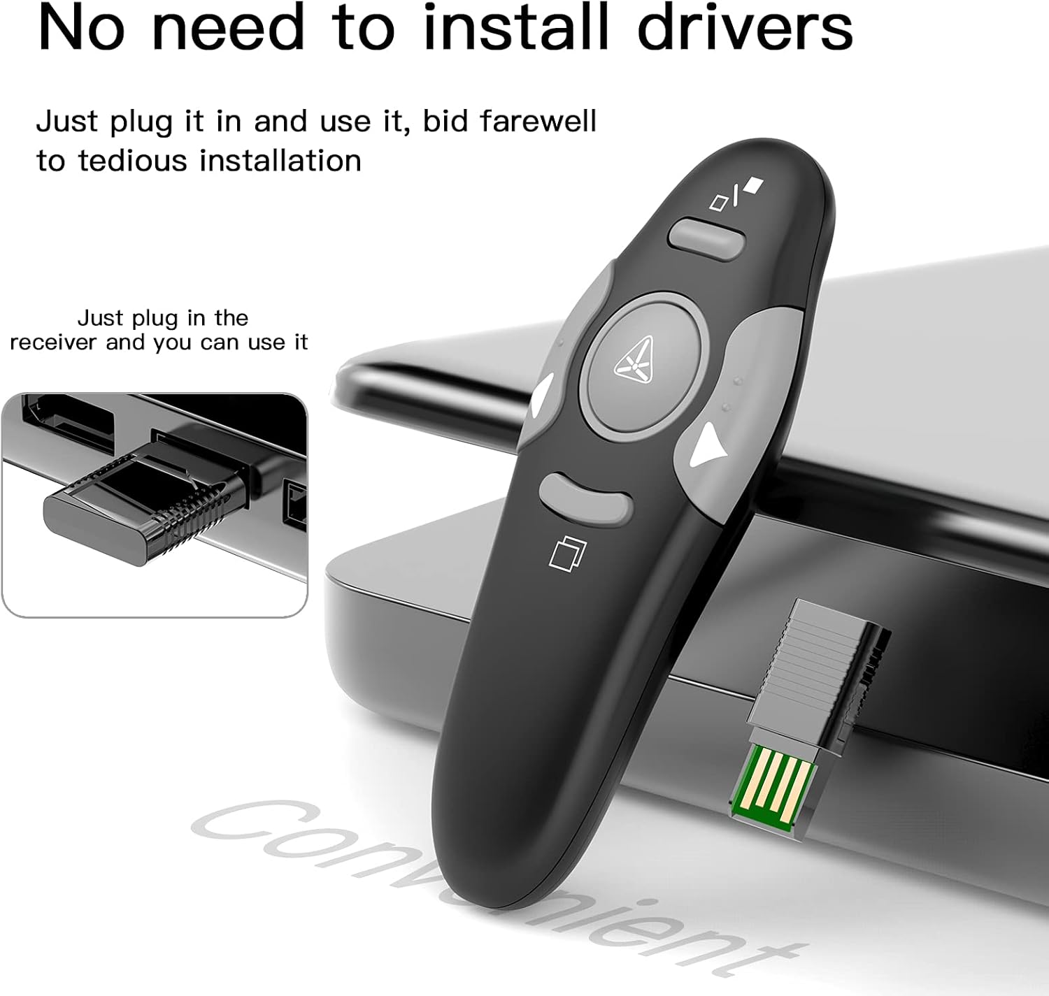 - Presentation pointer with Red Light Pointer--The presenter clicker boasts rf 2.4ghz wireless presenter with highly-sensitive signal without interference from others and can work well within as far as 100 meters. The built-in pointer satisfies national standards for office and classroom. The light is bright and steady to see clearly on any screens (not recommended for LED, LCD) even across a large conference hall.